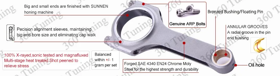 Количество:4 штуки в комплектеБолты:Включая подлинные 3/8 "ARP 2000 болты (Примечание: дополнительные расходы на обновление до ARP L19 болты)Материал:Кованая 4340 летательная Хромовая молистая качественная сталь для гонокДопуск по весу:Сбалансированный до +/- 1 г в комплекте