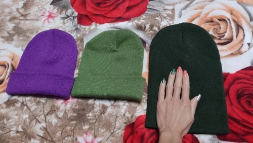 Шапочки ну просто с виду малипусенькие как на куклу, но тянуться хорошо, на детскую голову 7 лет отлично полноразмерно, на взрослую женскую как на фото продавца. На ощупь приятные но будут продуваться так что на тёплую весну осень. На фото в сравнении с моей шапкой розовая, голова не крупная у меня 56 см. Брала по 70 рублей так что всем довольна.