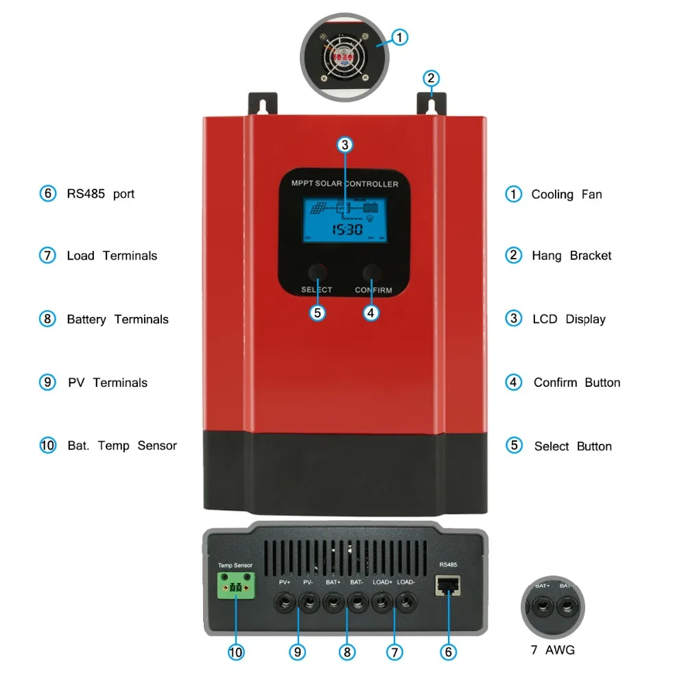 Большая часть информации может быть предоставлена ЖК-дисплеем, таким как: Тип системы, входное напряжение PV, входной ток PV, день/месяц/общая вырабатываемая энергия, тип батареи, напряжение аккумулятора, ток зарядки, мощность зарядки, ток нагрузки, мощность нагрузки и тд;