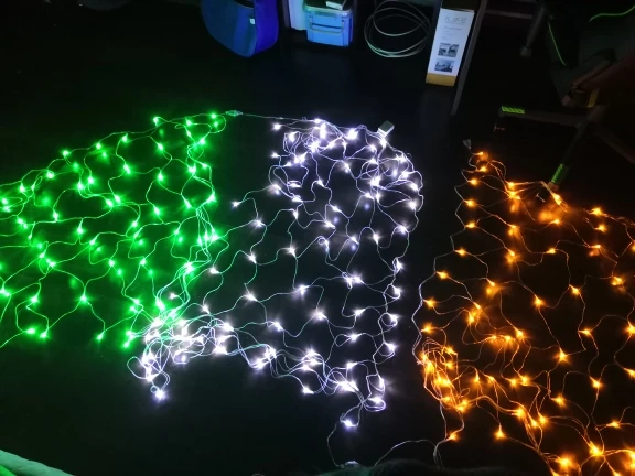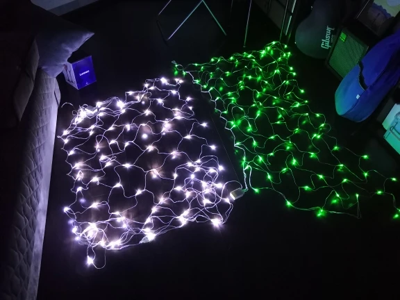 хорошее праздничное украшение. все заказанные сетки рабочие. гирлянды зеленого красного и розового цвета светятся довольно приятным насыщенным цветом.