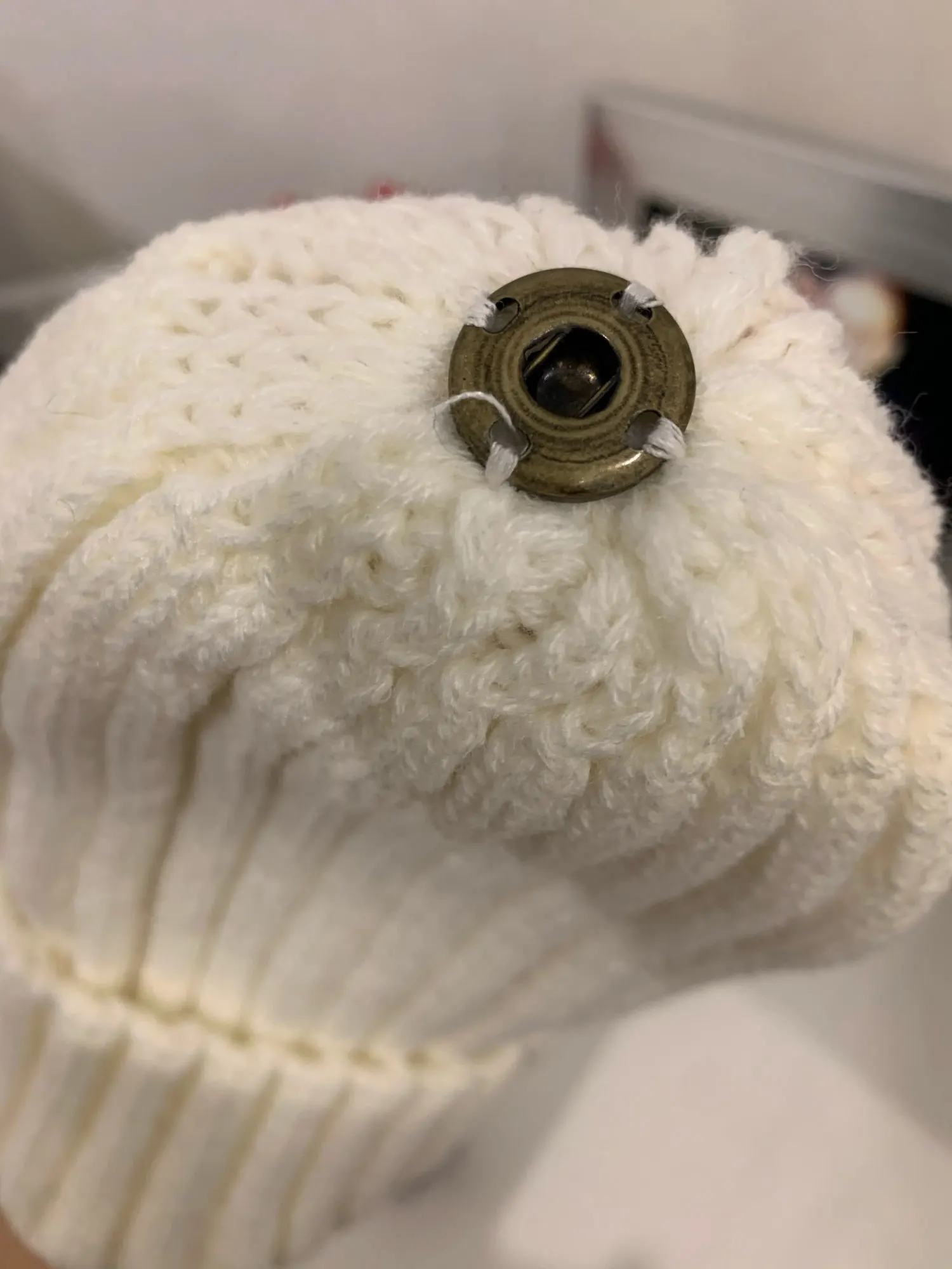 Шапка качественная, сидит хорошо, помпон на кнопке держится плотно. Состав - 100% акрил