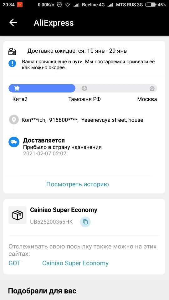 Страна: RU Доставка: Cainiao Super Economy 22.02.2021