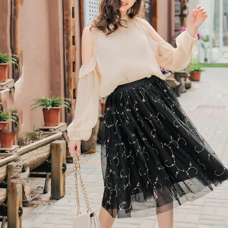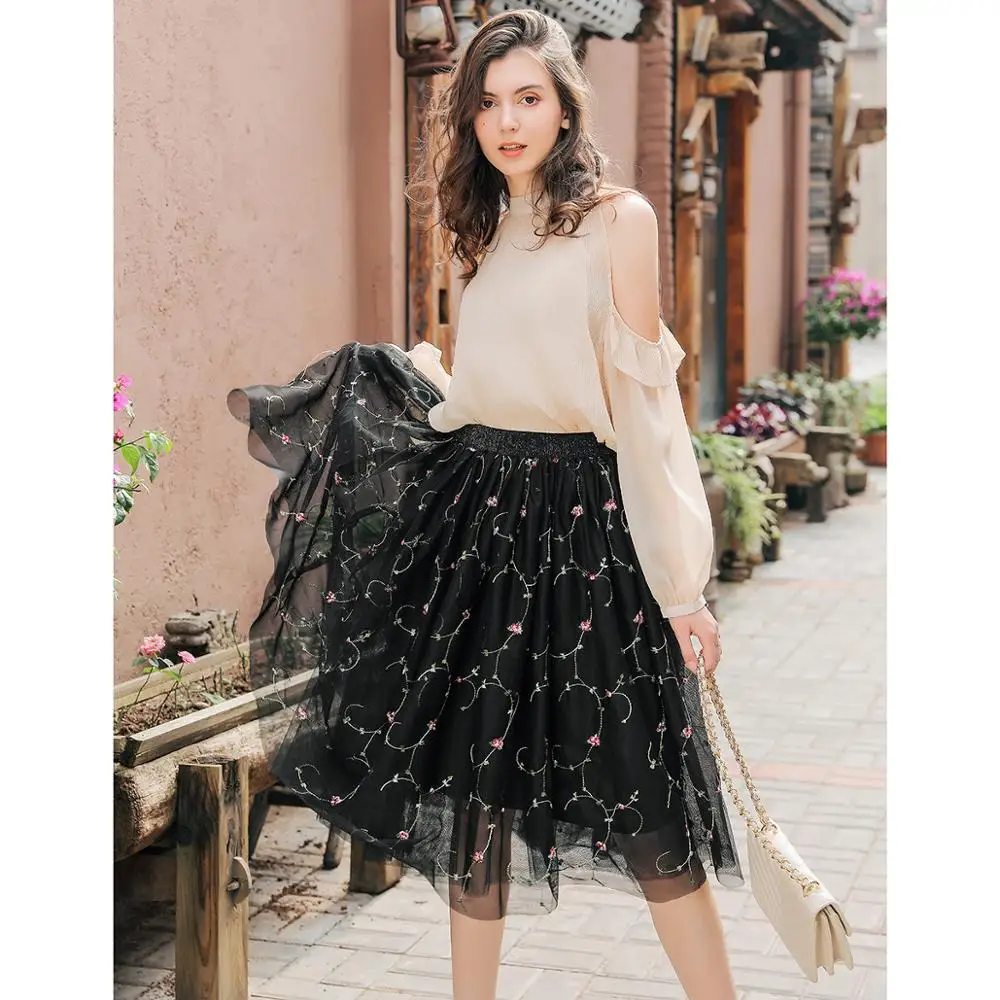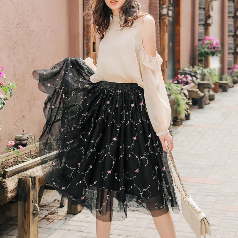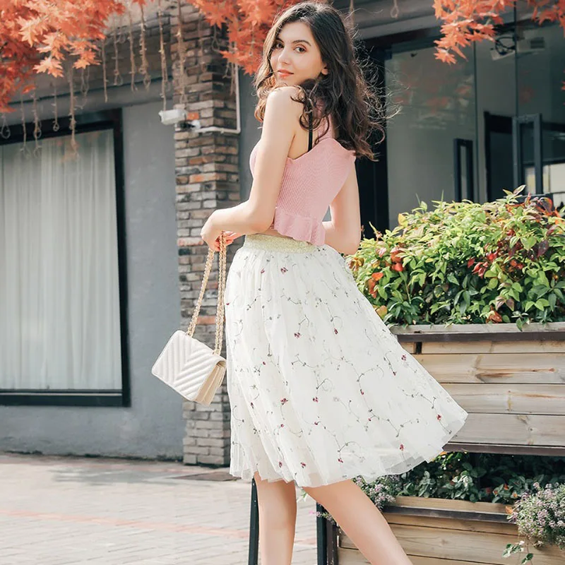 Модные сетчатые Юбки миди из тюля, Женская винтажная плиссированная элегантная юбка с цветочной вышивкой вечерние ринки, свадебная юбка с высокой талией