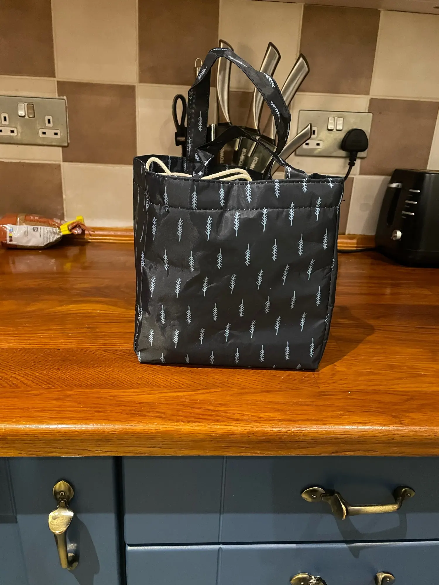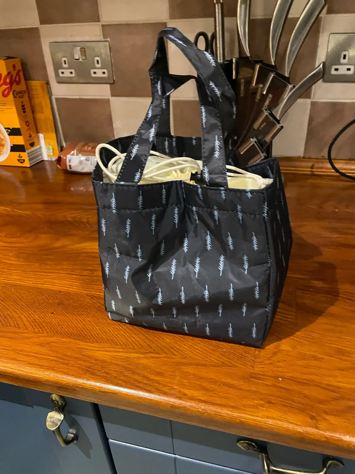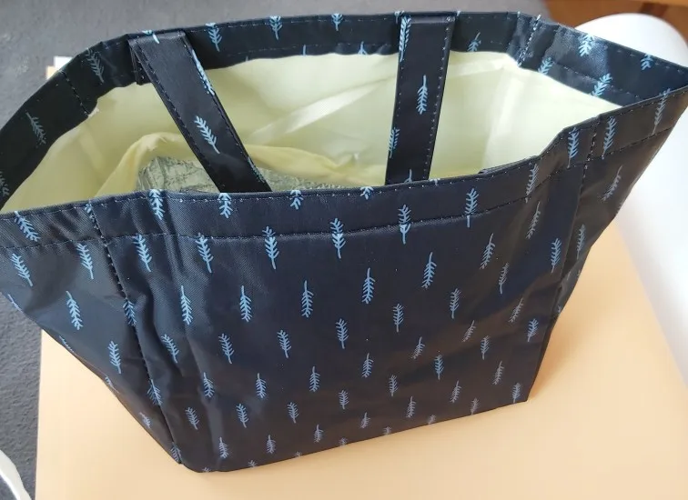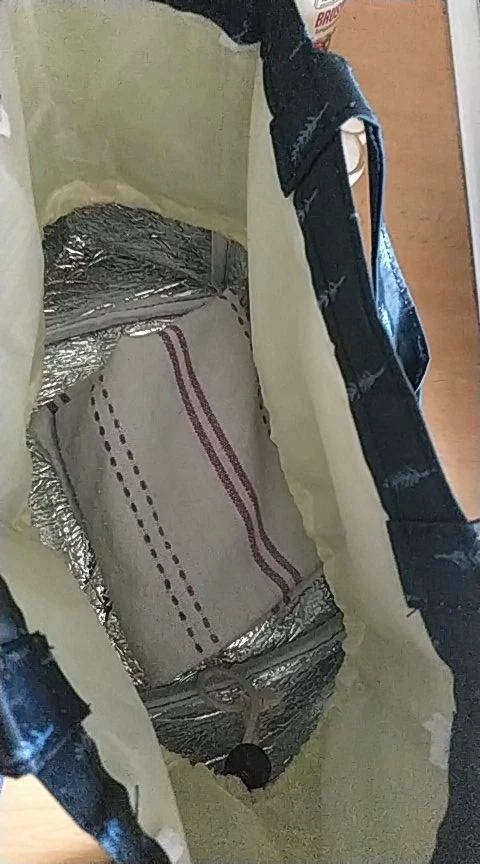 Очень маленькая, думала будет больше, подойдет только для обедов на 1 чел. Сшито аккуратно, нитки не торчат, термослой тонкий.