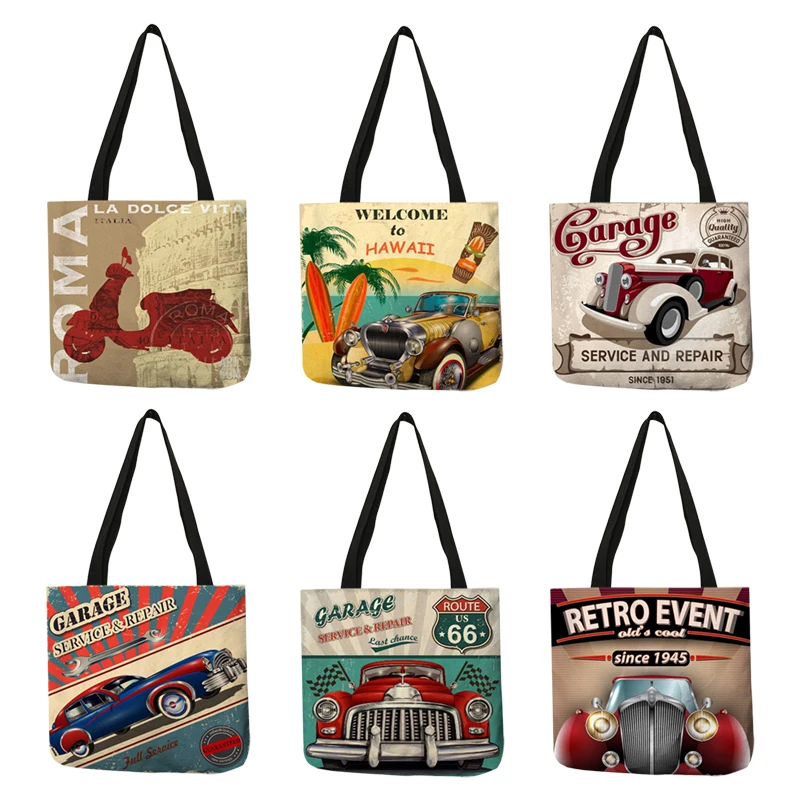 Винтажная Автомобильная сумка-тоут с принтом автомобиля, льняные сумки для покупок с креативным принтом, женские и мужские модные сумки