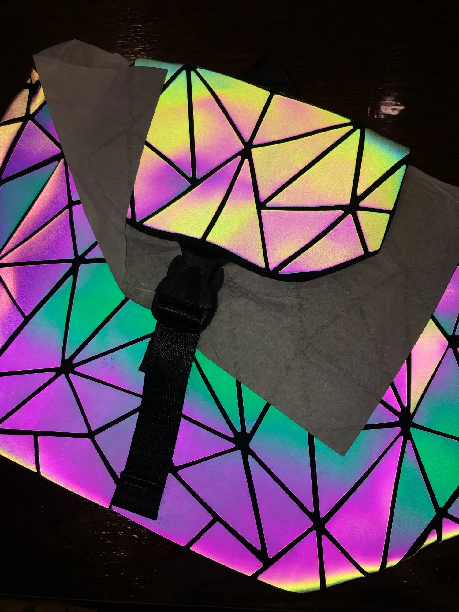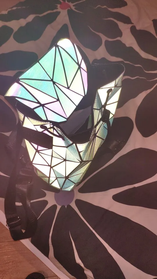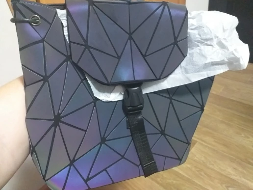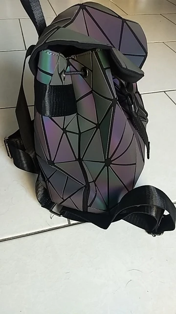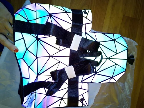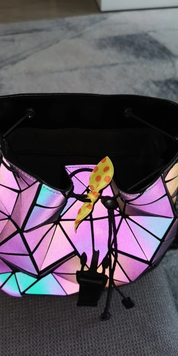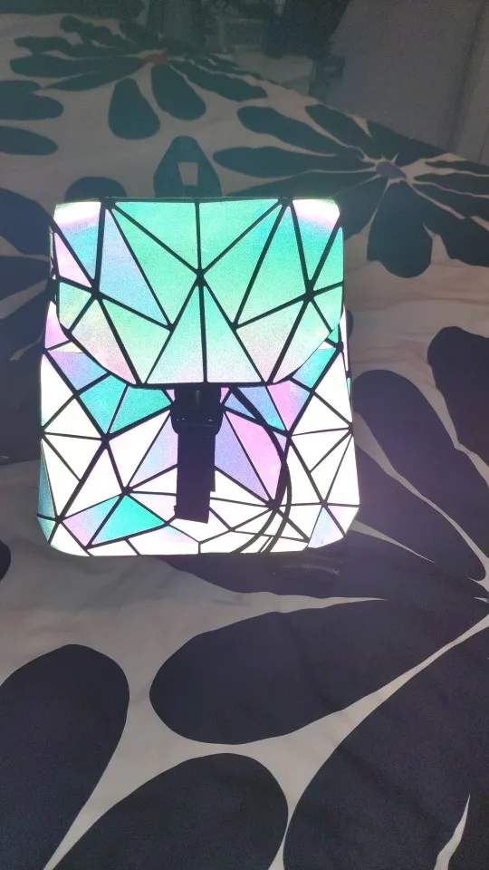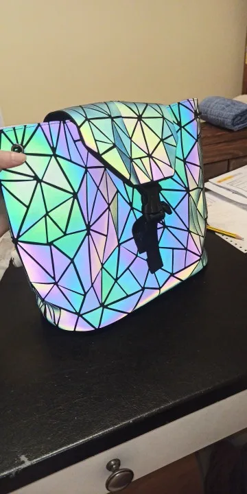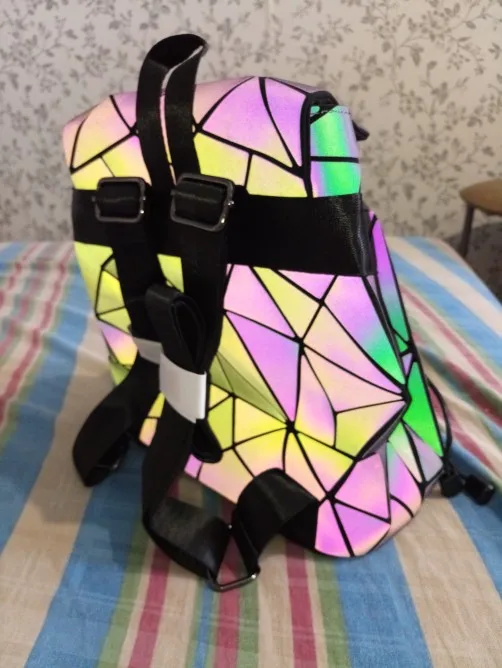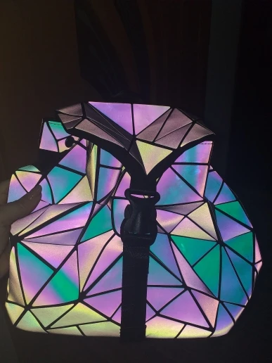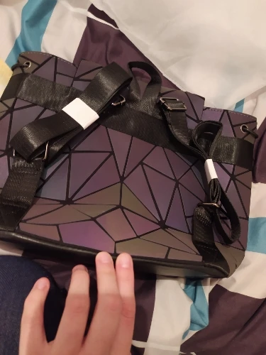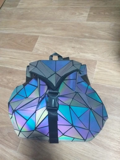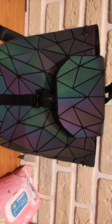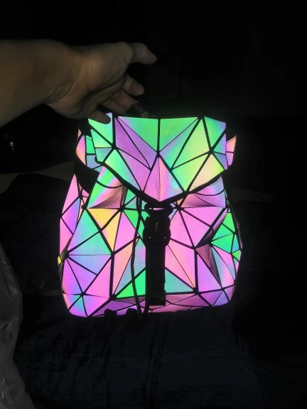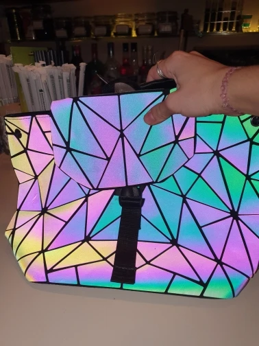 Шикарная сумка, как на фото продавца. Качество отличное, ремешки все плотные, хорошо сшитые. Светиться при свете вспышки от телефона и от фар машин, а так же при дневном освещении и солнце очень красиво переливается всеми цветами