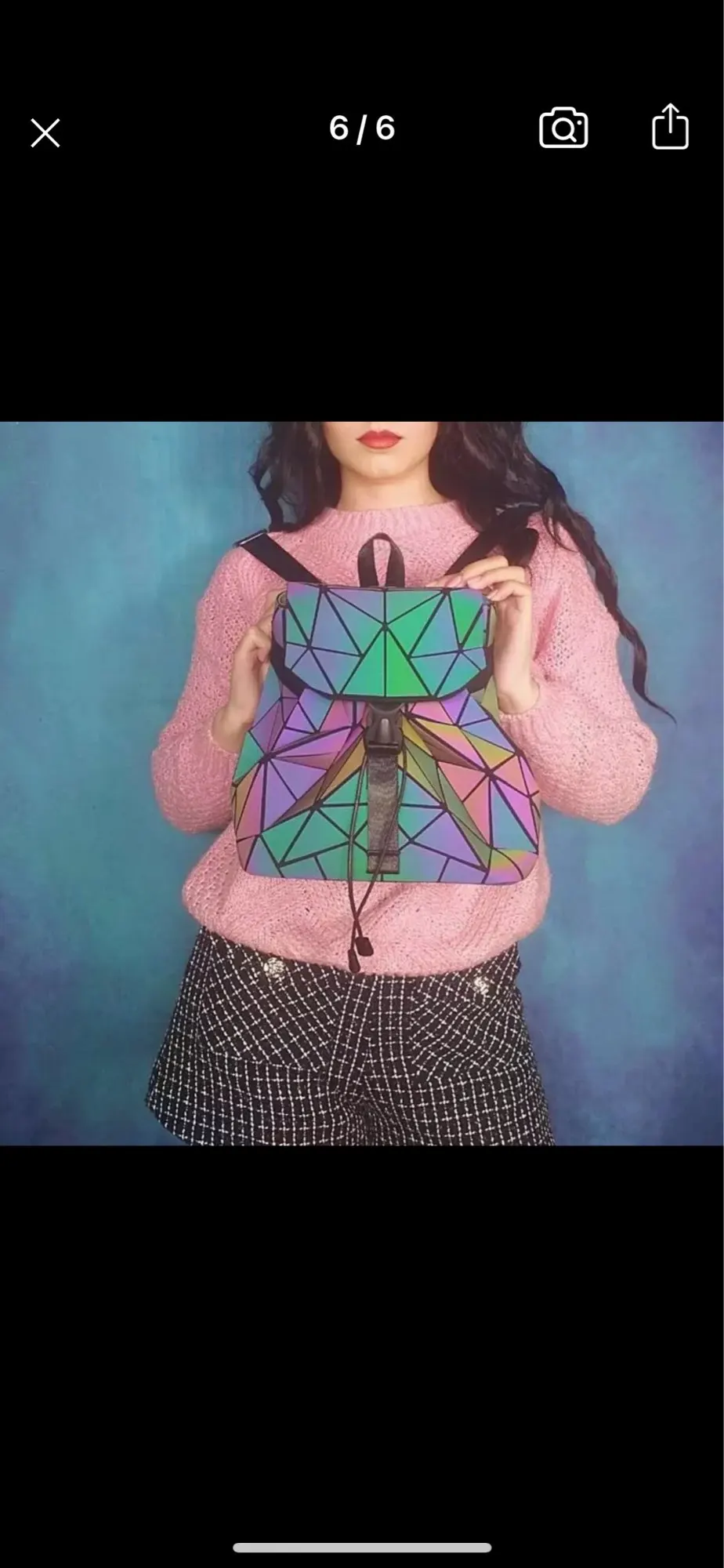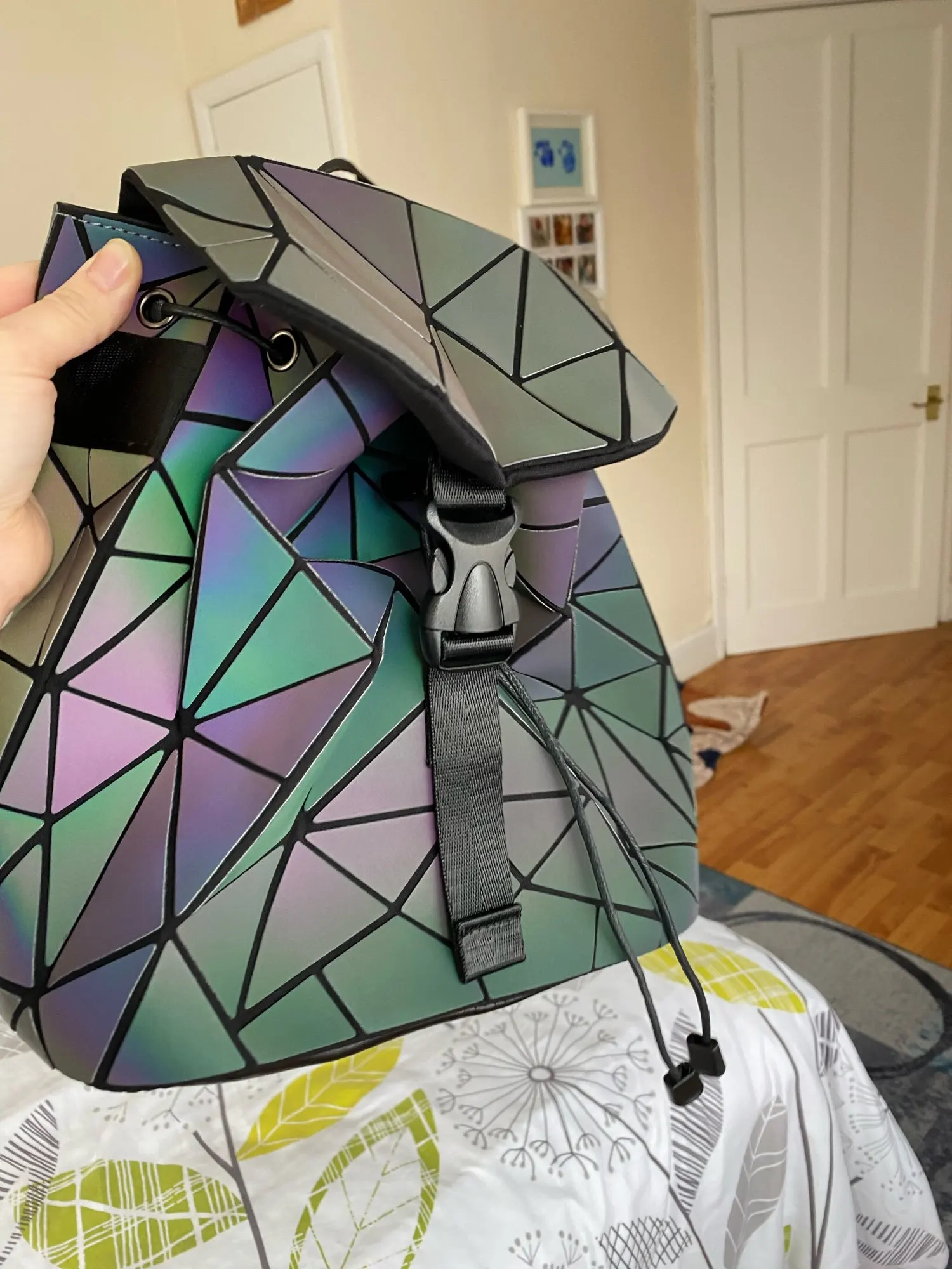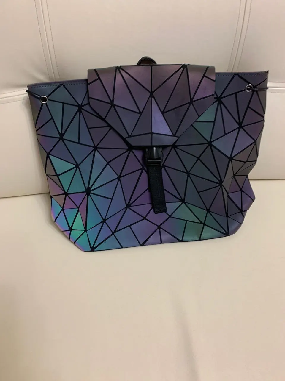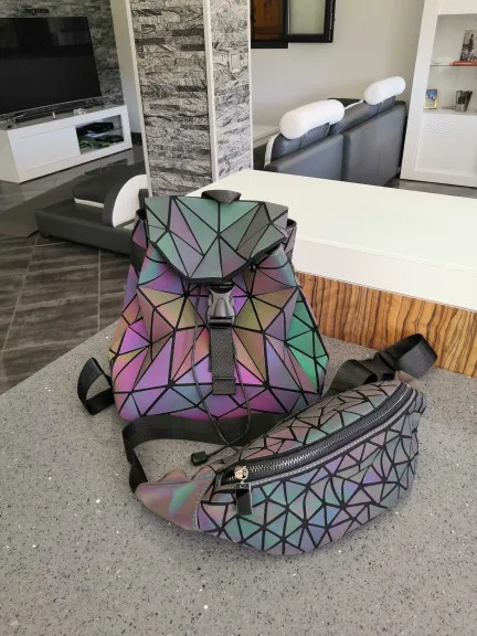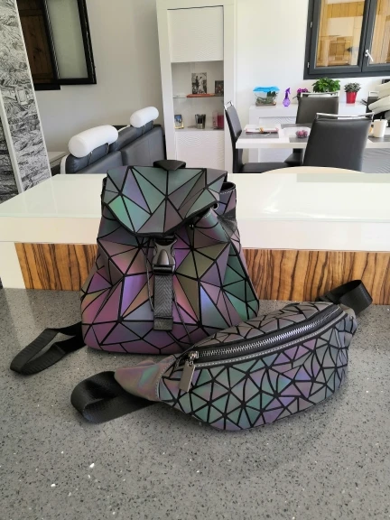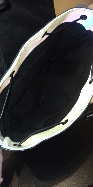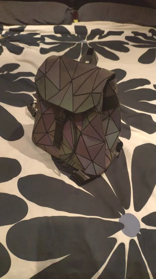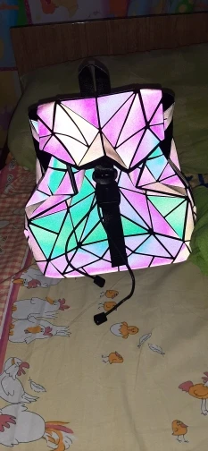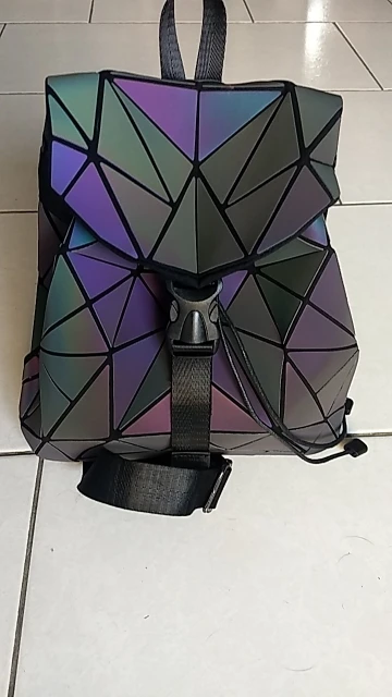 Шикарная сумка, как на фото продавца. Качество отличное, ремешки все плотные, хорошо сшитые. Светиться при свете вспышки от телефона и от фар машин, а так же при дневном освещении и солнце очень красиво переливается всеми цветами