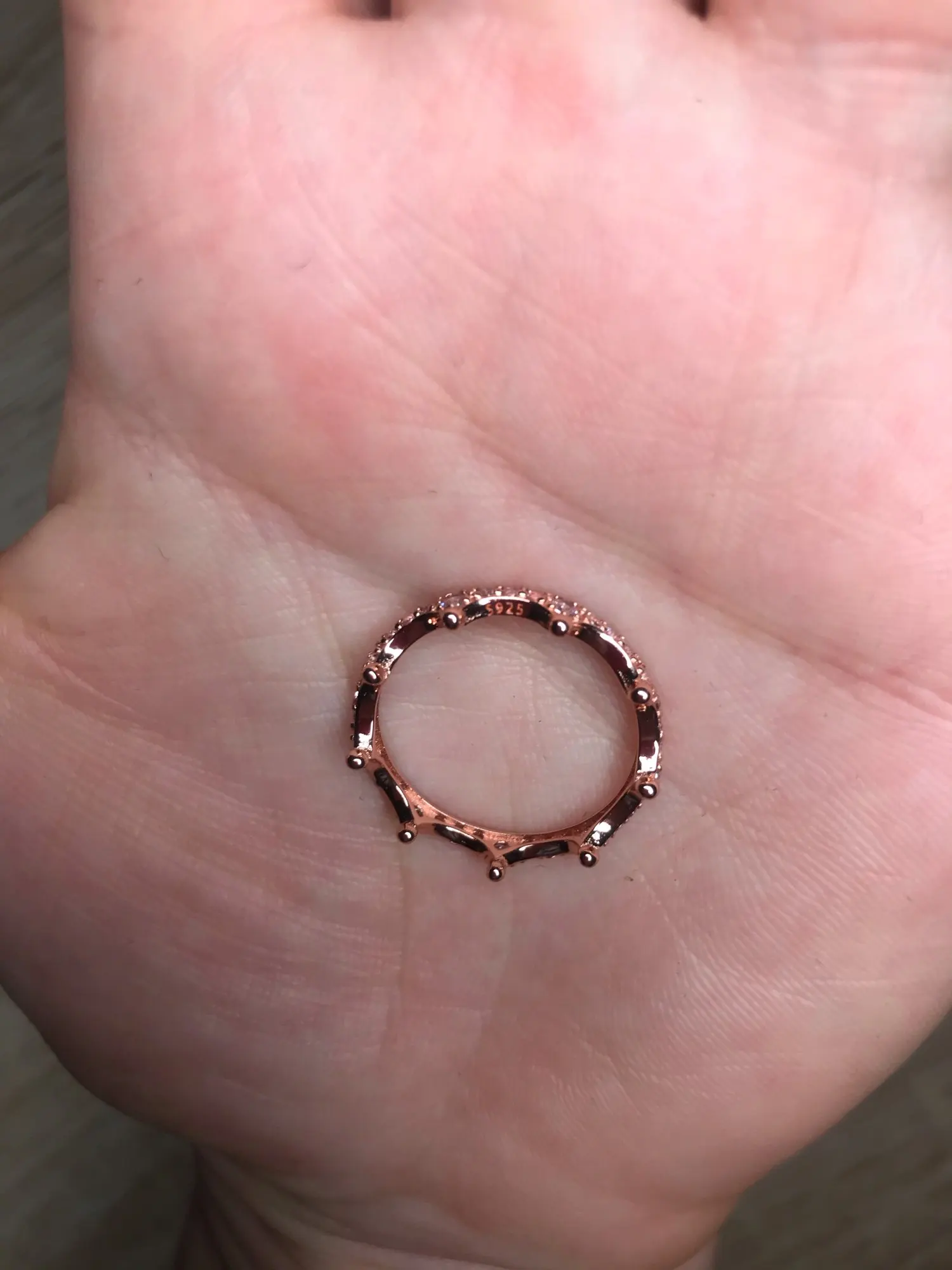 1. Заказала 15.11, прилетело в Москву на почту 26.11. Относительно, молниеносно! 2. По размеру кольцо почти совпало. Мой русский размер пальца 18. Иногда надеваю 18,5. Так вот этот 9 размер продавца именно, как русский 18,5. Возможно, даже между 18,5 и 19 размером. Мне немного свободно, но это даже хорошо. 3. Само кольцо с пробой S925, что означает серебро. Покрытие мне непонятное. Потому что пробы и метки на покрытие никакой нет. Метка Пандора так же отсутствует, и я сравнила цвет кольца с оригинальным кольцом Пандора. (Не таким же, но все же) цвет хороший, но чуть розовее оригинала. Камушки все на месте, а это уже огромный плюс(судя по комментам ниже), да и продавец профи. Спасибо ему за возможность носить красивые изделия за не баснословную цену. (Всего-то 395,88 деревянных) P.S. Очень хорошая копия.