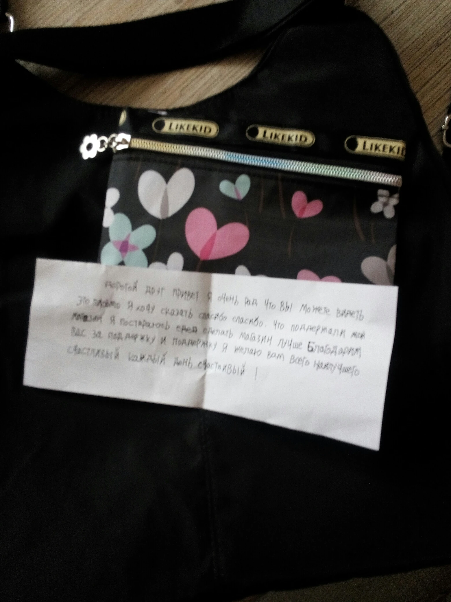 Огромное спасибо продавцу за очень качественный и красивый заказ!!! Сумка просто огонь!!! Фабричная строчка, вместительная, на 3 отделения. 2 на магнитных замках, посредине на замке. Очень красивый цвет! Очень удобна при использовании! Рекомендую всем этого продавца и магазин!!! Процветания вам!!! Ещё хочется добавить, что в сумочке ожидал очень милый сюрприз: косметичка и маленькое письмо от продавца!!! Огромное вам спасибо!!! Очень приятно!!!
