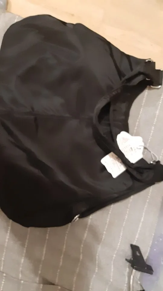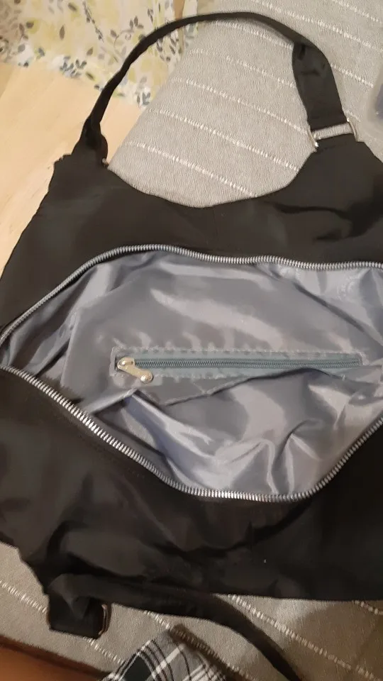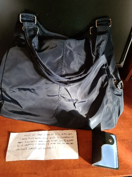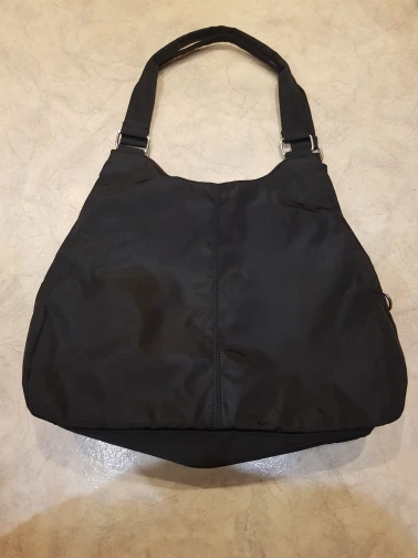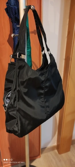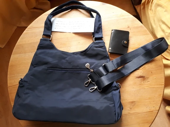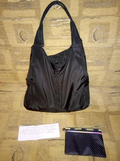 Сумка оч. лёгкая, сшита аккуратно. Три отделения: основное - на молнии и два - на магнитных кнопках. Есть два маленьких простых кармашка "под телефон" и два - на молнии: один внешний и один внутри. Если носить на правом плече, то молния застёгивается назад и тк молния до половины сумки по высоте, то получается, как выражается моя мама, "сумка для воров"(((- придется носить на левом или переставлять "собачку" молнии в обратную сторону. Полезный объем начинается см на 5 ниже верхнего края - те сумка выглядит вместительнее, чем кажется. Внутри лежал ещё длинный ремень-лента на карабинах, но он не для неё ну совсеееем, на плече она и со своими ручками удобна. Подкладка - плотная, шуршащая. Продавец положил записку с подарочком - кошелёчком на 8 карт - Очень приятно, СПАСИБО!