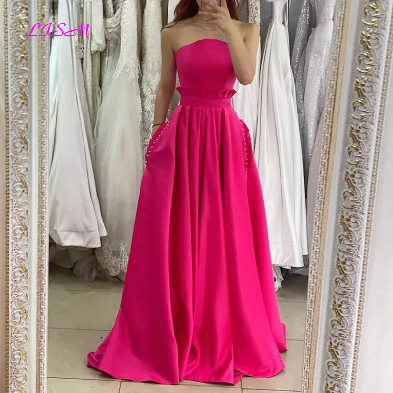 Фуксия, трапециевидные атласные платья для выпускного вечера, длинные женские вечерние платья с бусинами и карманами, женское официальное праздничное платье