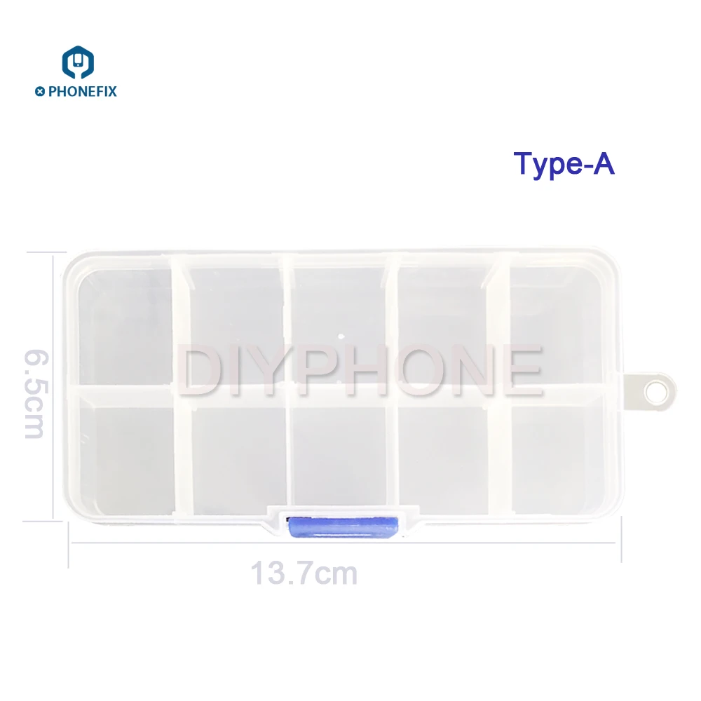 Пластик многоцелевой контейнер коробка имеет характерную тянущаяся, гладкая, устойчивый к высоким температурам и коррозии. Этот прозрачный пластиковый ящик для хранения может содержать множество инструментов для ремонта телефонов и частей для ремонтных винтов телефона, вы также можете отрегулировать внутреннюю инструкцию в соответствии с вашими потребностями в случайном порядке. Материал для этой экологически чистой коробки не выпустит поврежденного газа. Сетки с 10 и 15 отсеками могут удовлетворить ваши потребности в легком и компактном освещении, простота хранения и поиска нужного вам ремонта телефонов