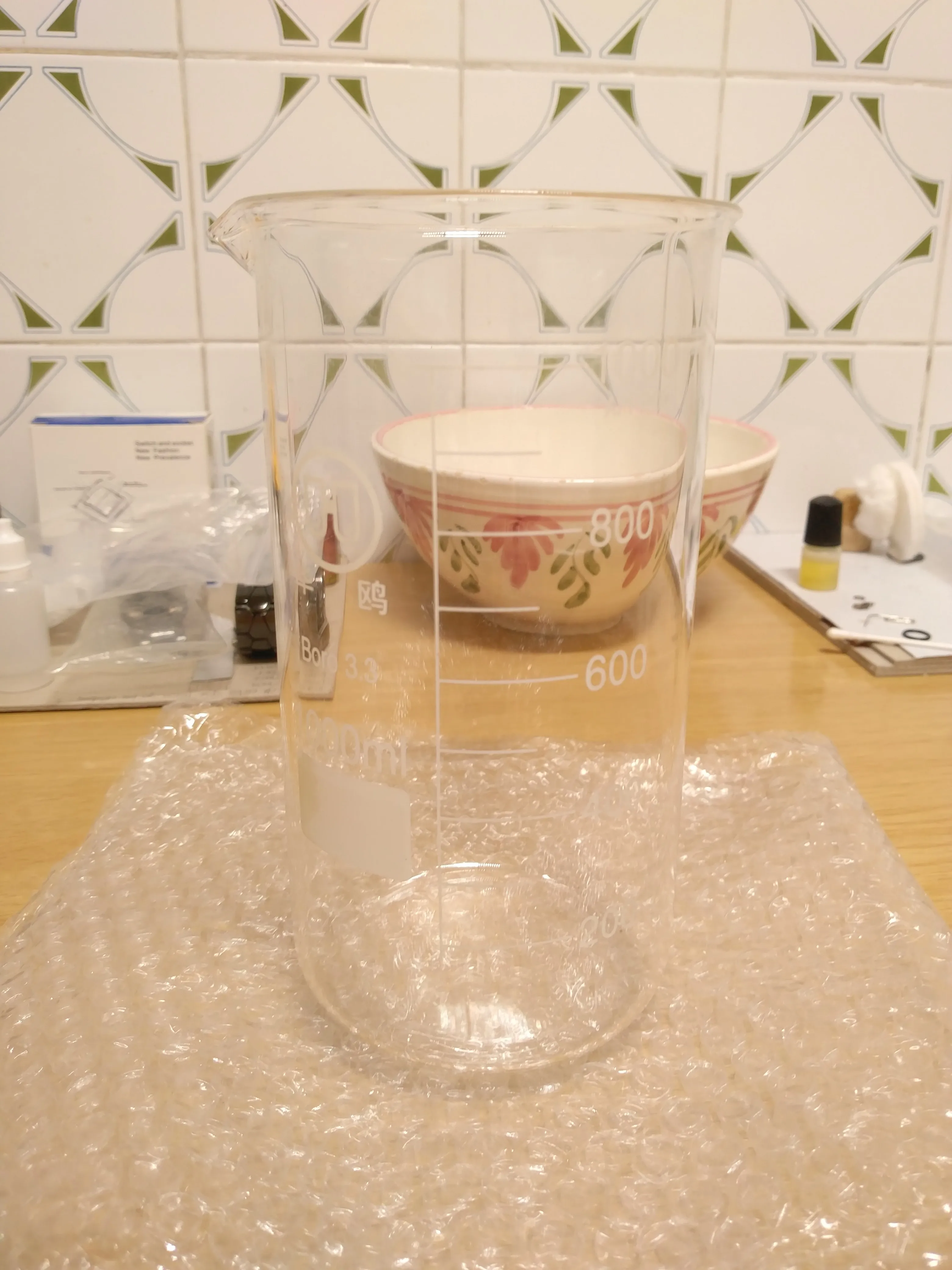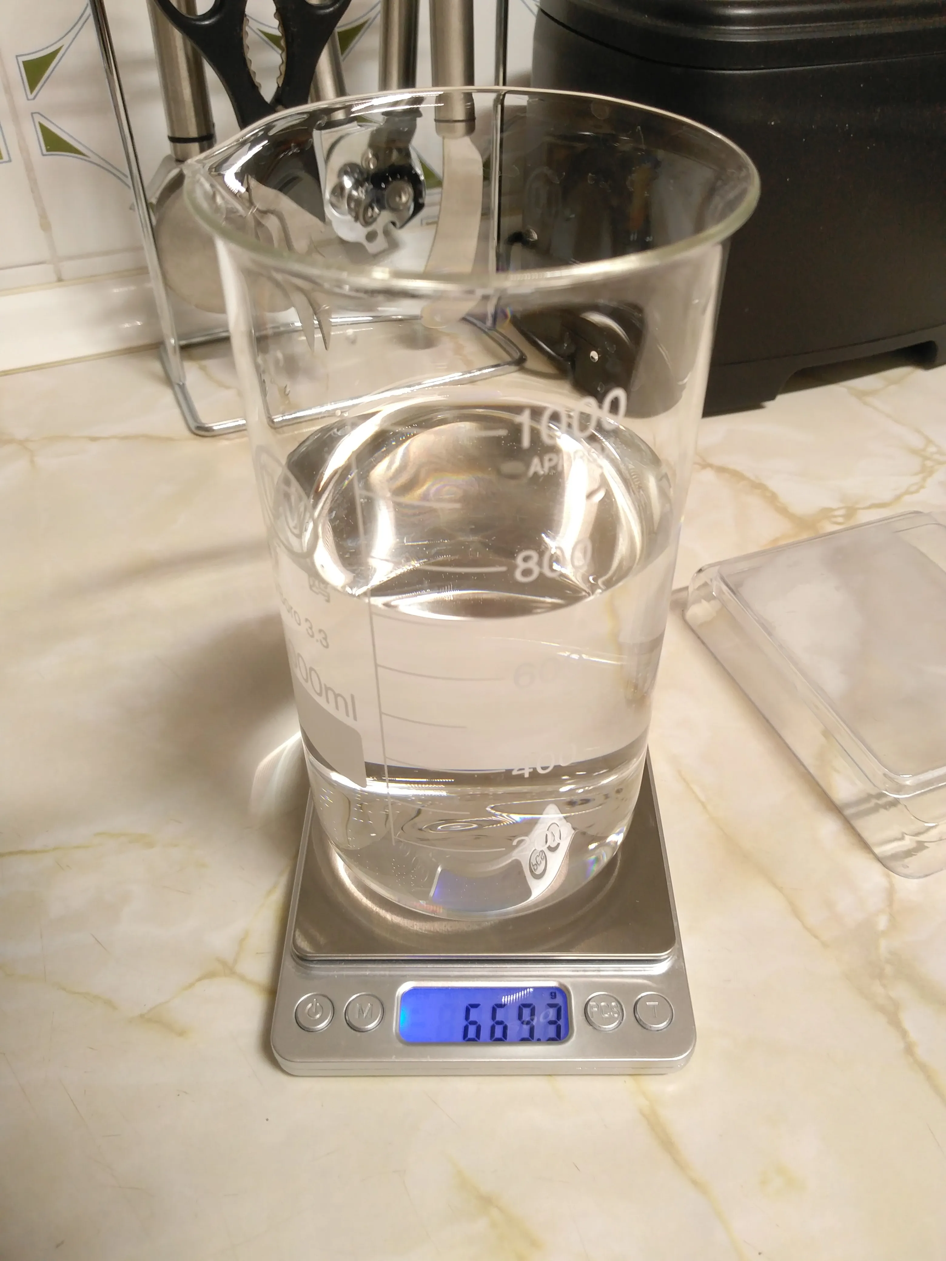 Beaker Градуированный шкальный тест и другие данные.- Измерения веса сделаны с цифровой шкалой разрешения 0,1 г. Измерения диаметра и ширины сделаны с диаметром 0,1 мм, если не указано иное. Высота измеряется линейкой и острым глазом. Вес нетто удерживаемой водопроводной воды, когда мой стакан был заполнен точно до каждого градуированного уровня: 200 мл: 216,5 г 300 мл: 307,6 г 400 мл: 399,8 г 500 мл: 489,8 г 600 мл: 581,4 г 700 мл: 669,3 г 800 мл: 759,7 г 900 мл: 848,2 г 1000 мл: 937,7 г Комментарий: Градуированные уровни могут быть более точными; Их точность является умеренной. Вес чайника: 251,0 г Внутренний диаметр сверху: 89,3 мм. Ширина Стенки Чайника: 2,3 мм. Наружный диаметр: около 93,5 мм с помощью линейки keen eye. Высота стакана: 181 мм. Вывод после некоторого использования: общее качество стакана довольно хорошее.