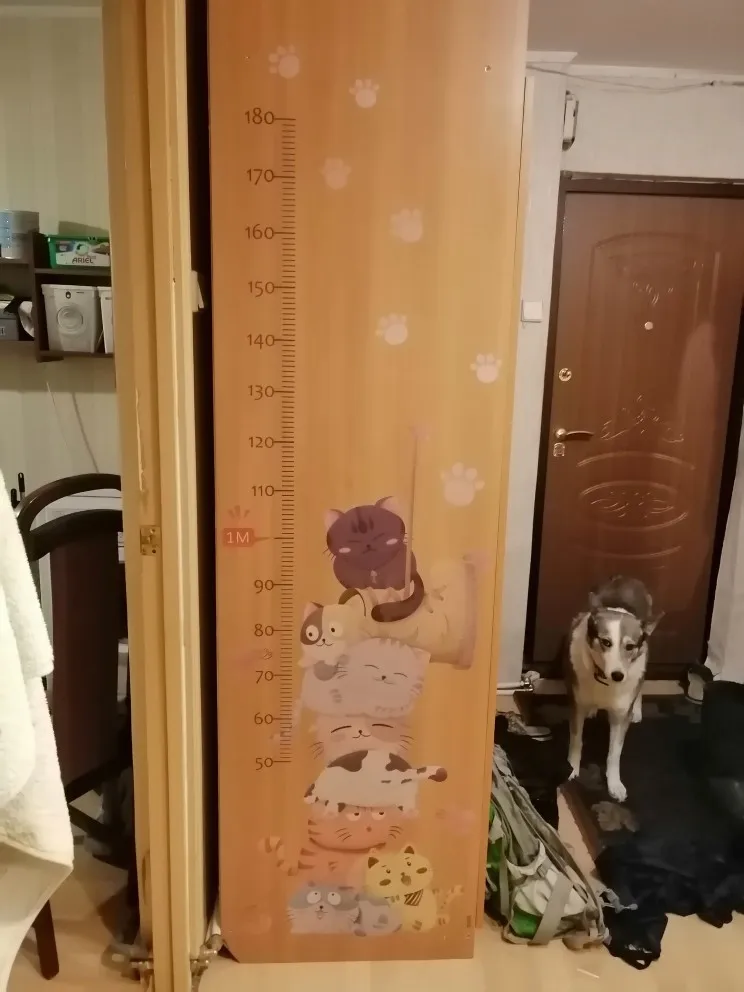 Посылка пришла не мятая, что уже хорошо)приклеивается хорошо. С точки зрения метрологии - все точно. Очень милые котики)) Но есть и недостатки: Сама наклейка хорошо просвечивает. Белая ДСП или стекло - идеальное место (никак не коричневый шкаф). Сантимитровая лента прерывистая, поэтому приходится наклеивать соседствующие деления друг на друга.