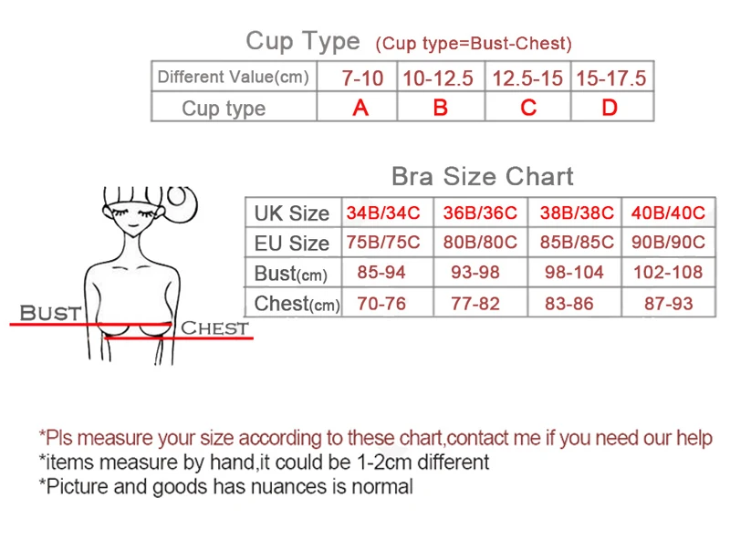 Размер груди: 75,80,85,90(= Размер: 34,36, 38,40, размер чашки: B,C)