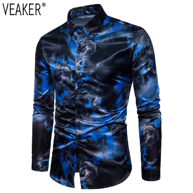 Мужская приталенная рубашка, из шелка и сатина, с принтом, с длинным рукавом, для вечеринки, деловой Топ, весна 2021, S-2XL
