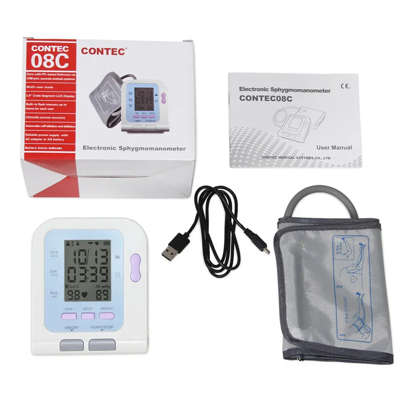 CONTEC08C-это настольный электронный сфигмоманометр с сегментом ЖК-дисплея. Он может точно измерять SpO2 и NIBP (Spo2Зонд необходимо приобрести отдельно)И отображение результатов измерений с большим шрифтом. Электронный Сфигмоманометр может хранить результаты измерений трех пользователей и до 99 элементов для каждого пользователя. С функцией записи данных Обзора, прост в использовании.
