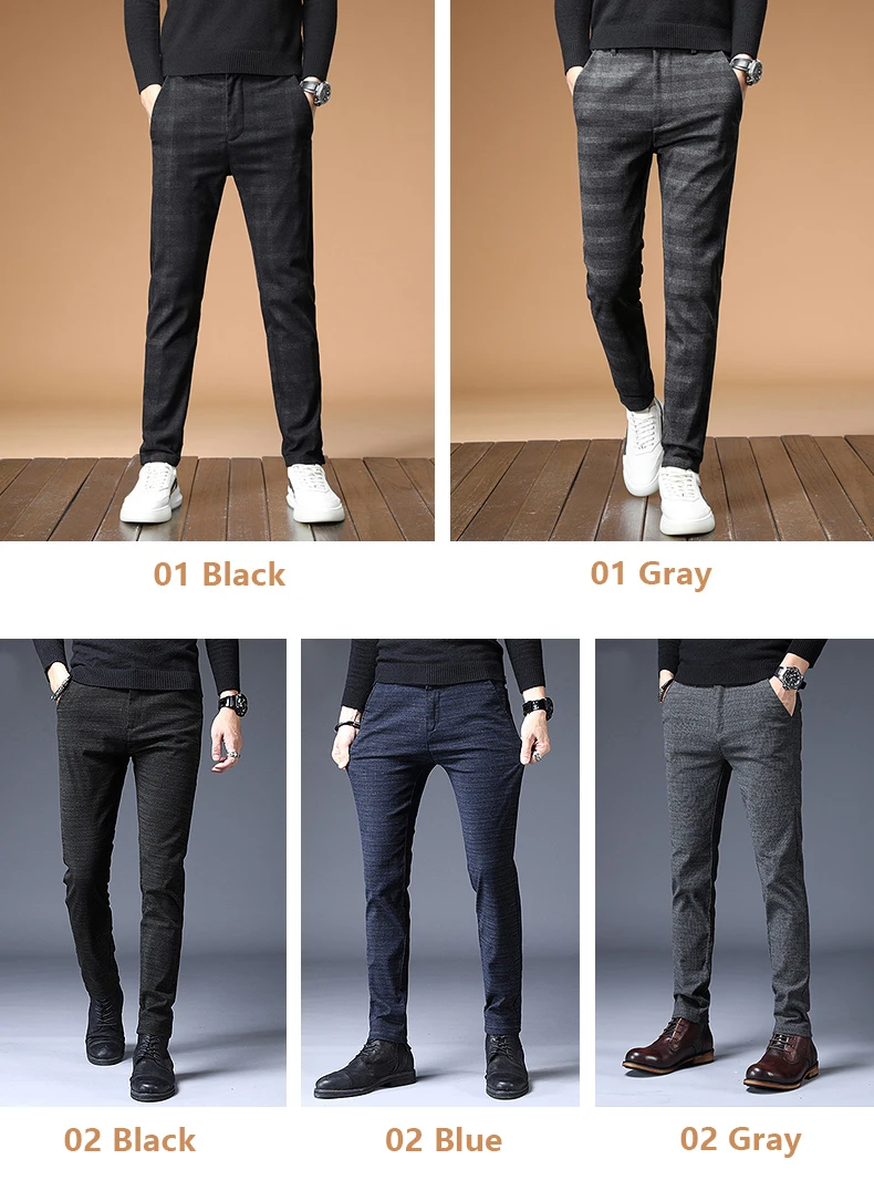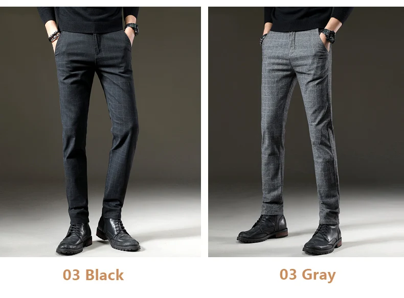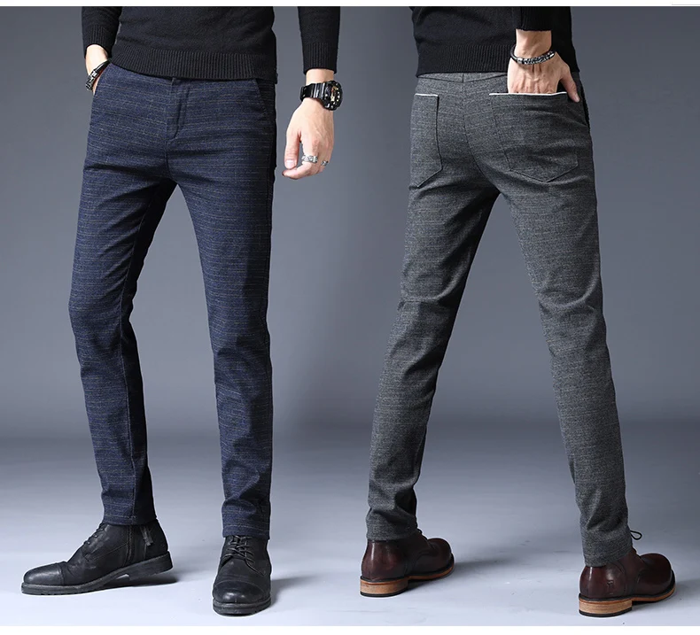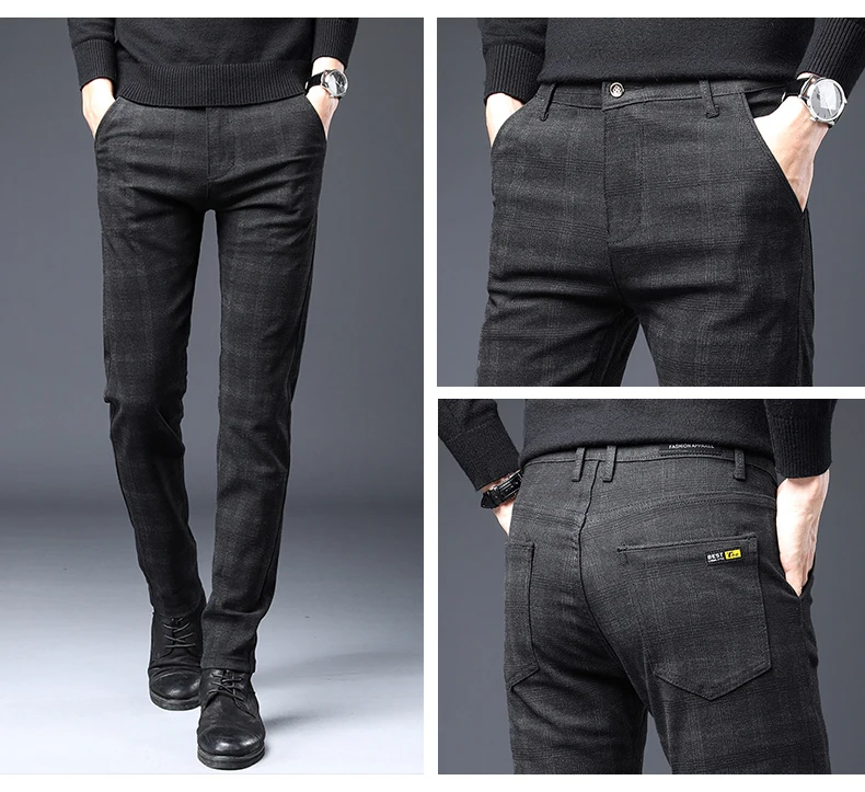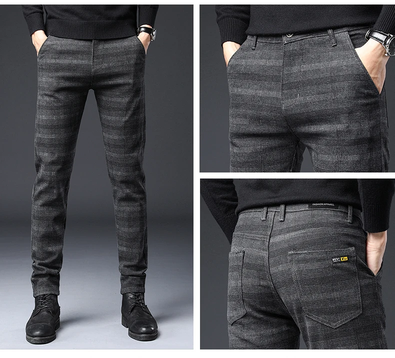 Брендовые мужские клетчатые брюки, повседневные эластичные длинные брюки, хлопковые серые, черные, синие облегающие рабочие брюки для мужчин, классическая одежда для бега