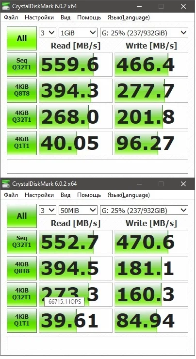 Заказ пришел за две недели (Новая Почта), отслеживался на всем пути следования. Продавцу - 5 звезд, спасибо. SSD 128 GB отличный. Установил его в Mini PC взамен вышедшего из строя. В Linux скорости чтения/записи следующие: localhost:~ # dd if=/dev/zero of=tempfile bs=1M count=1024 1024+0 records in 1024+0 records out 1073741824 bytes (1.1 GB, 1.0 GiB) copied, 1.03566 s, 1.0 GB/s localhost:~ # /sbin/sysctl -w vm.drop_caches=3 vm.drop_caches = 3 localhost:~ # dd if=tempfile of=/dev/null bs=1M count=1024 1024+0 records in 1024+0 records out 1073741824 bytes (1.1 GB, 1.0 GiB) copied, 2.46804 s, 435 MB/s