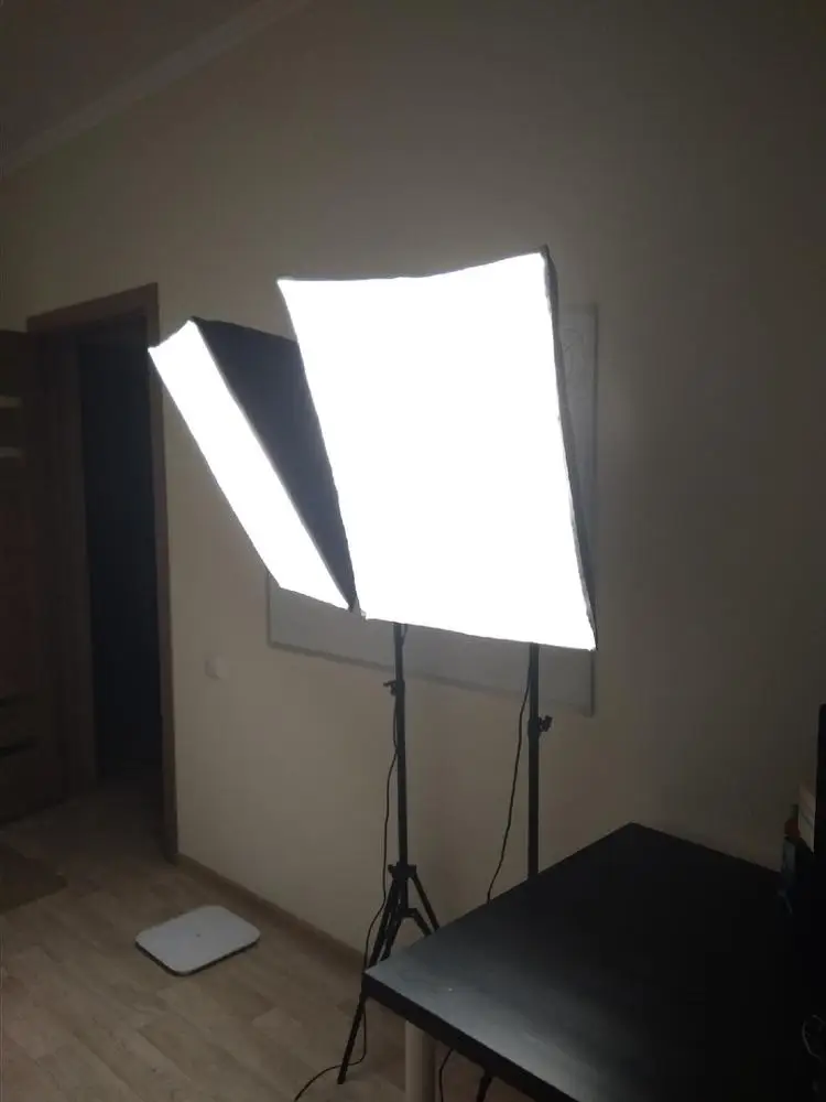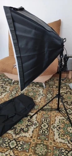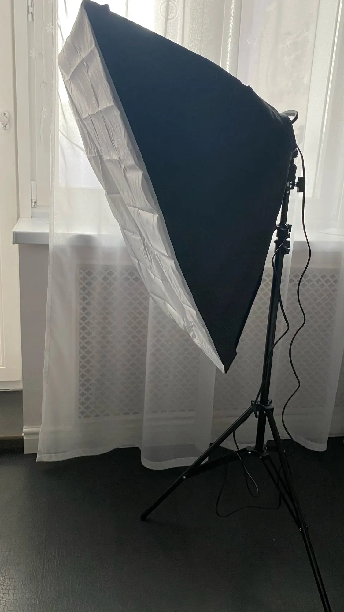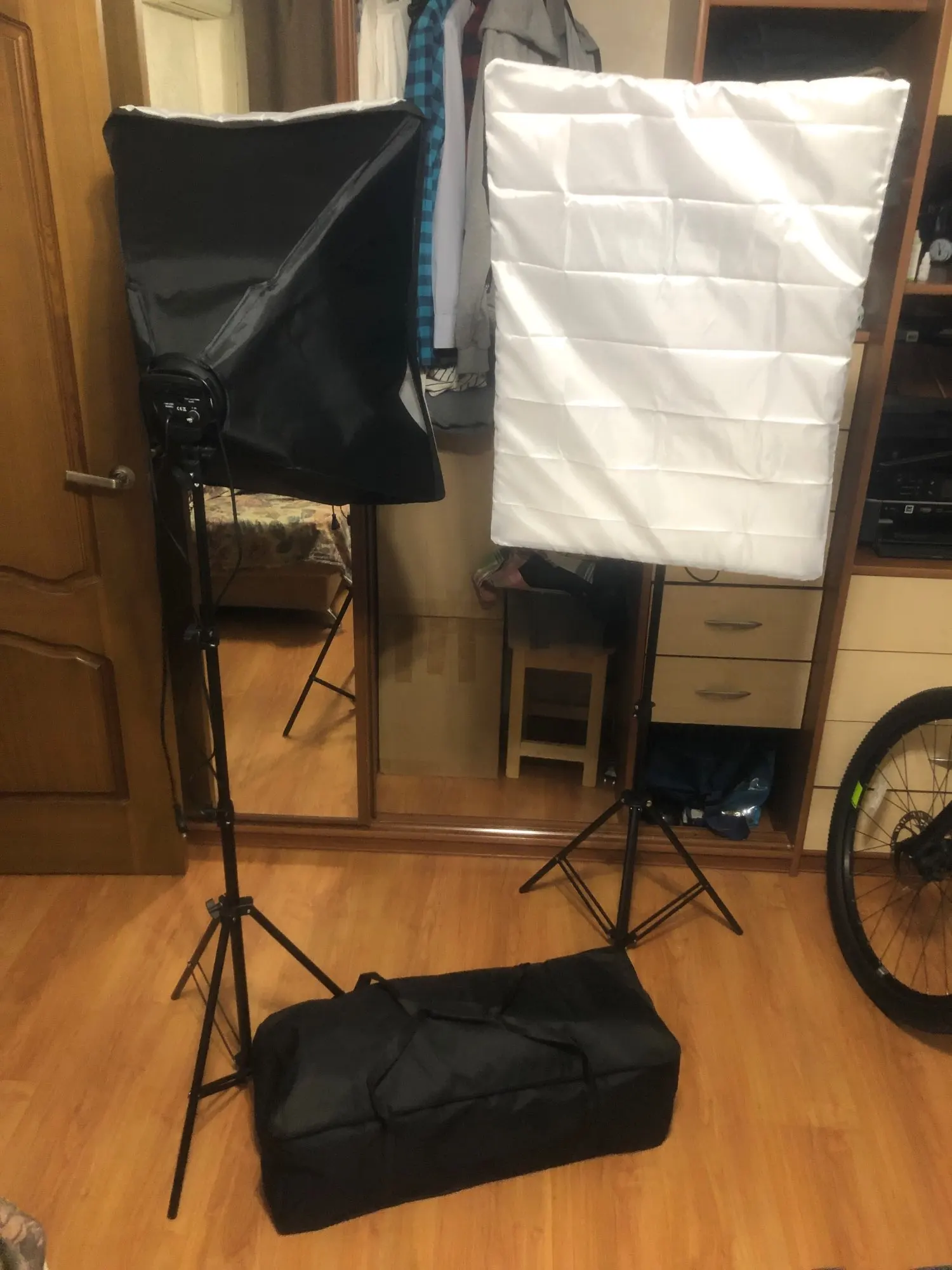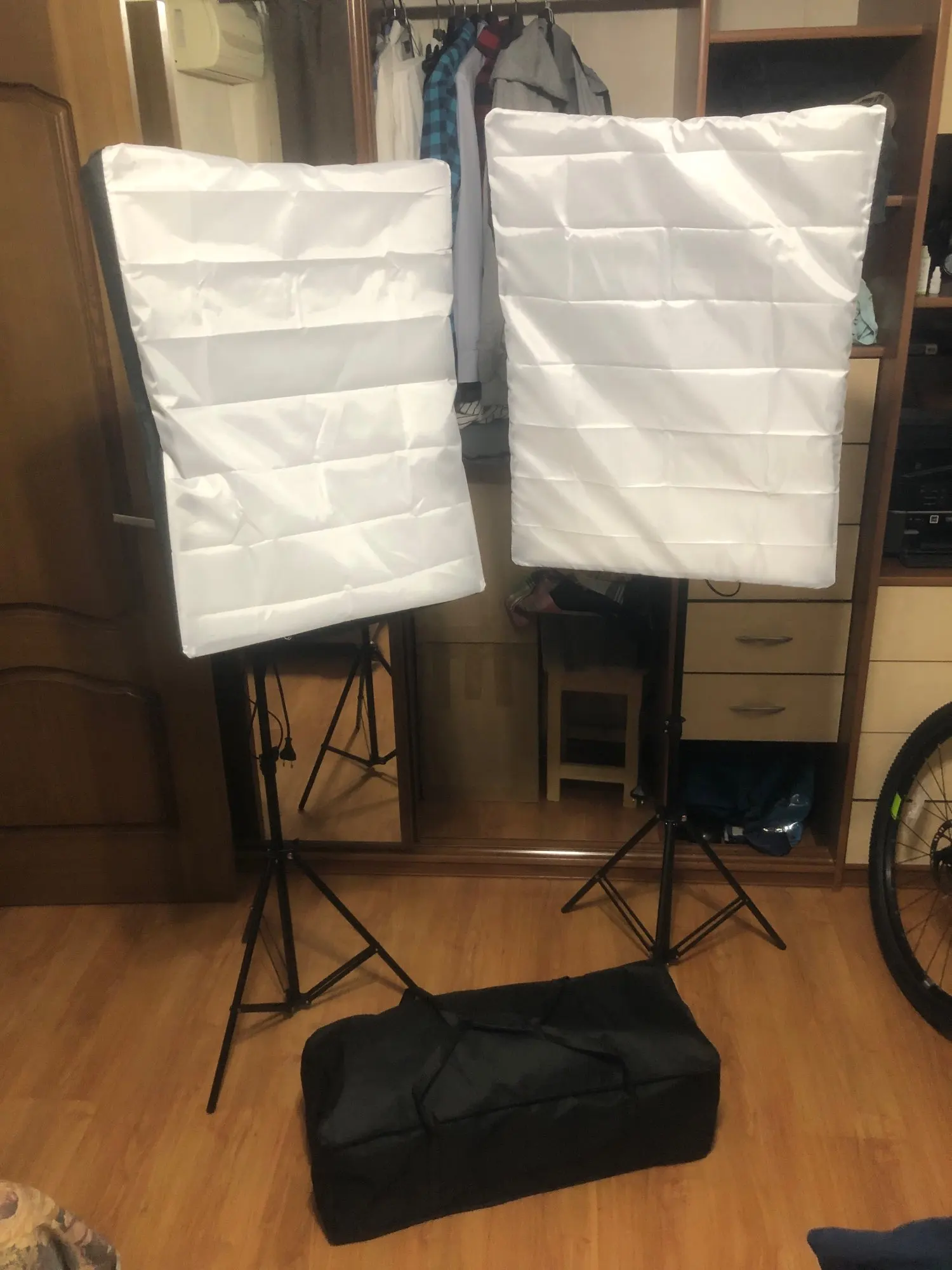 Классная вещь. Я давно хотел купить это. Всë пришло быстро. В комплекте сумка для переноски всего комплекта, плюс отдельные чехлы для софт бокса. Теперь нужно покупать ещё один для подсветки с верху. Вообщем советую, отличная вешь.