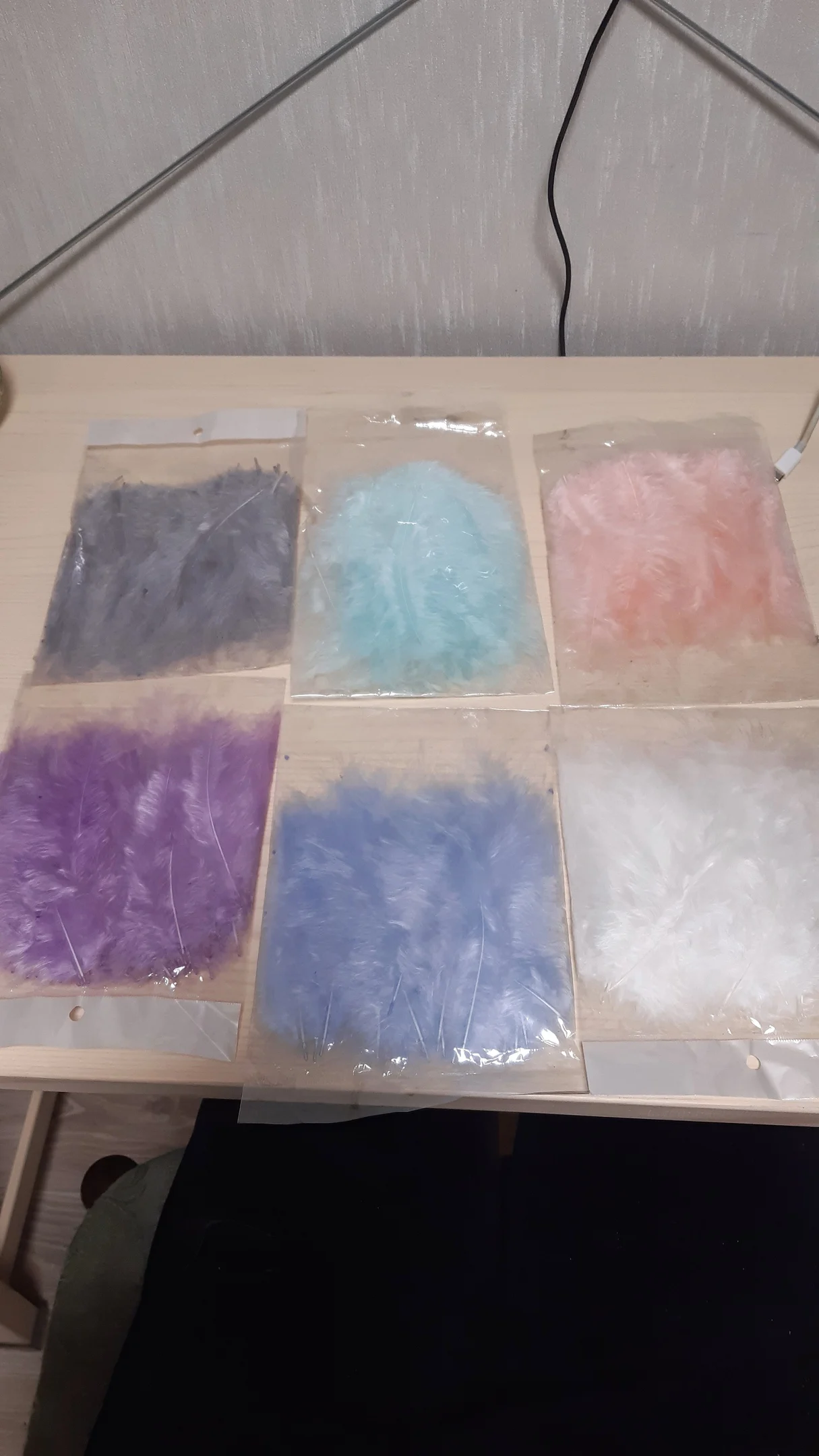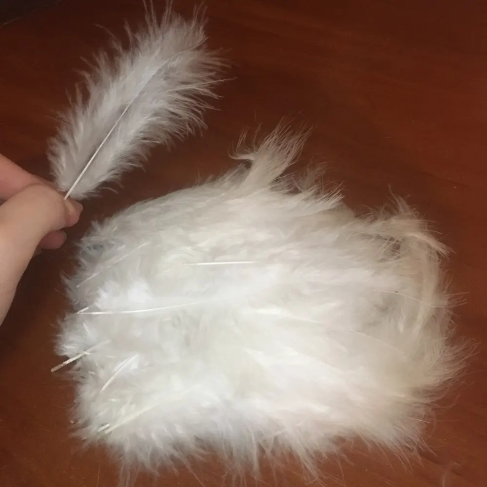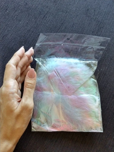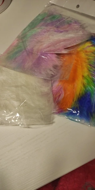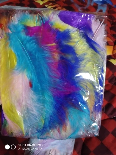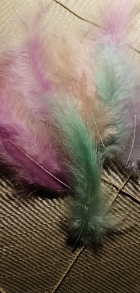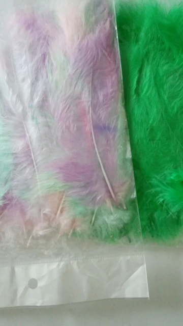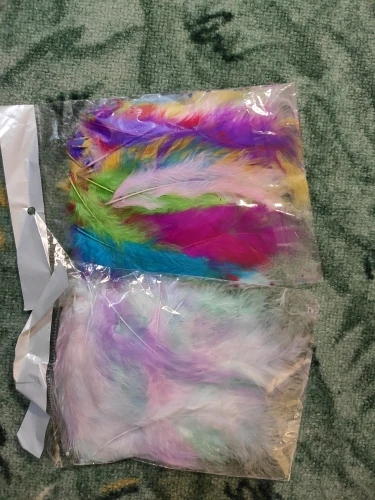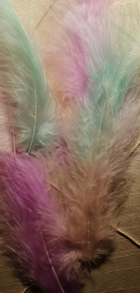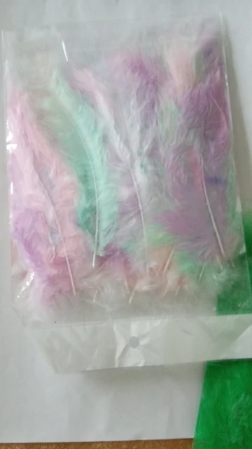 Хорошие перья. Соответствуют описанию, количество 50-51 штучка. Цвета как на фото, очень нежные и красивые. Есть разные по качеству и хорошие длинные, но и тонкие и короткие, встречаются слипшиеся. Есть что-то типа хлопьев краски, но они легко очищают. Когда достаешь из упаковки довольно много пуха летит, но потом вроде такого нет. Брали за 40 рублей, своих денег стоит.