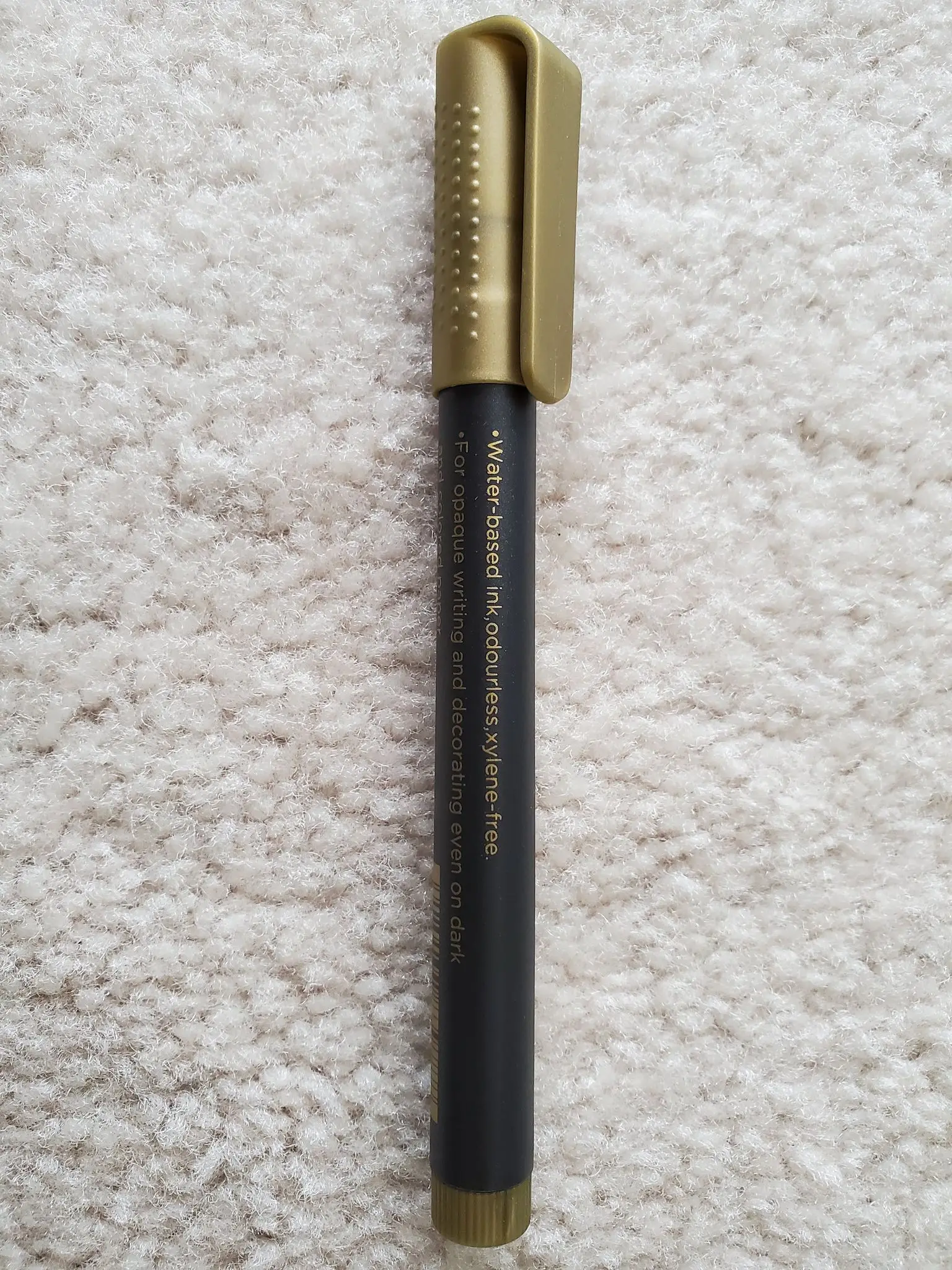 Я купил этот маркер, чтобы использовать его в качестве финиша на моих восковых уплотнениях, и это замечательно. Он крепкий с большим количеством чернил, крепким фетровым наконечником и очень легким. Крышка имеет прекрасную защелку, когда она выключается, поэтому я уверен, что она не высыхает долгое время без использования. Металлический цвет этого маркера просто великолепен, и фотография, которую я сделал, не делает это справедливым. Вы действительно можете увидеть мерцание под разными углами и с лучшим освещением. Полностью стоит покупки за свою цену и качество. Маркер прибыл в течение 21 дня с момента покупки (я заказал их 2 ноября, и они прибыли 23 ноября) и в хорошем состоянии.