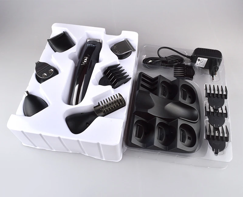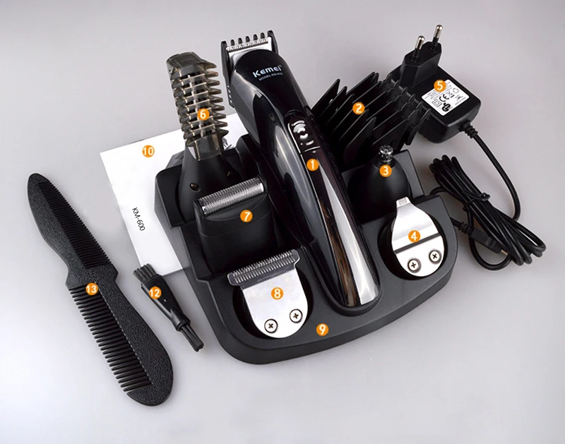 1 x Основная машинка для стрижки волос 5 x Сменная головка 4 x направляющая расческа 1 x Кабель питания 1 x подставка 1 x Расческа 1 x маленькая щетка 1 x руководство пользователя на английском языке
