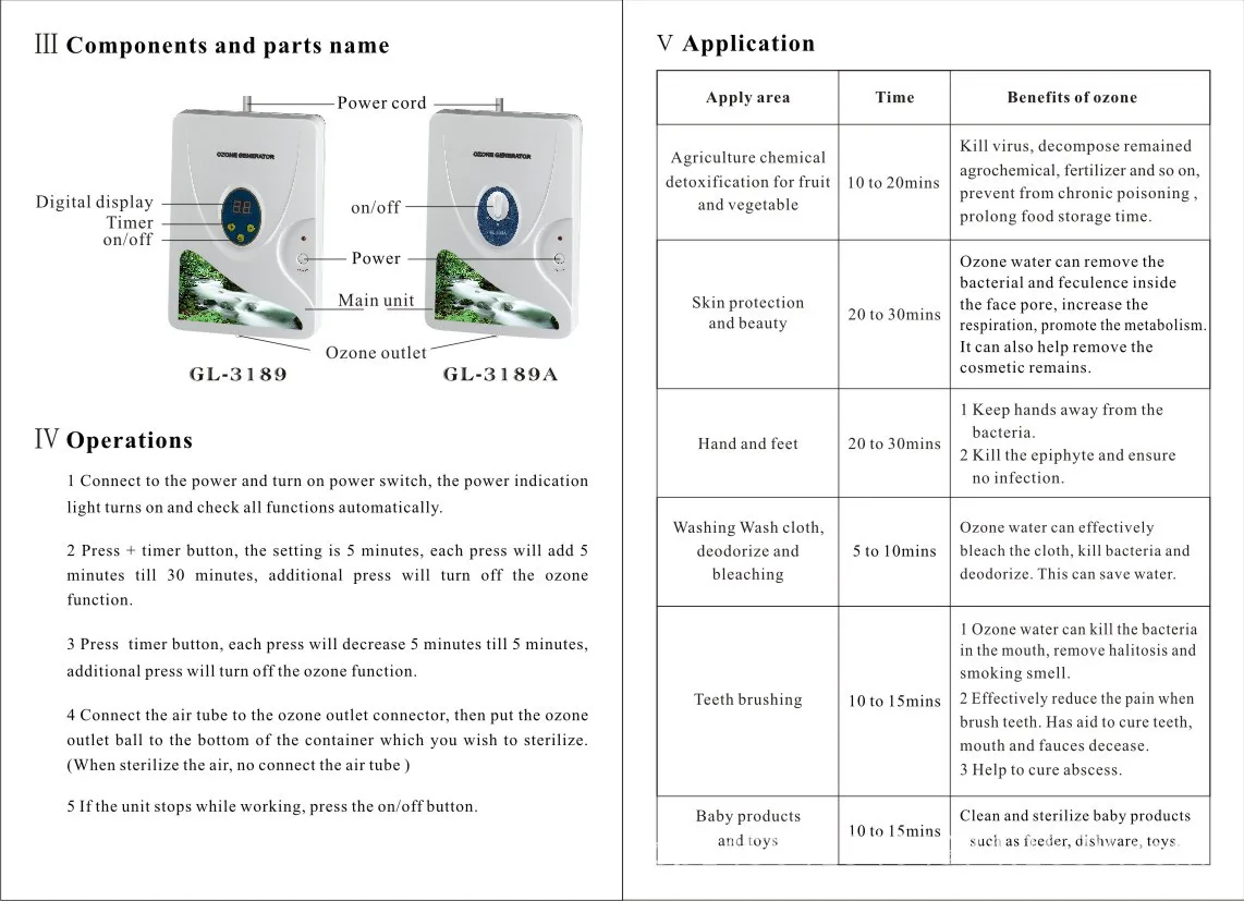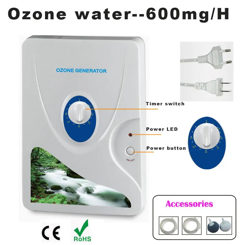 Основные характеристики: Особенно подходит для сауны.Генератор озона поставляется со всем необходимым для удаления запахов, уничтожения вирусов, бактерий и плесени, даже для очистки питьевой воды.Портативный, может быть транспортирован и использован из одной комнаты в другую.Простой светодиодный дисплей, чтобы очень легко использовать нужные настройки.8 Вт Номинальная мощность, энергосбережение и обеспечение длительного срока годности.Работает естественным образом, без каких-либо химических веществ. Технические параметры:Напряжение: AC110V 60Hz для штепсельной вилки США, AC 220V 50Hz для штепсельной вилки ЕС.Номинальная мощность: 8 Вт.Выход озона: 600 мг/ч.Время работы: 1 - 60 минут. Уровень шума: ≤ 50dB Озоновая функция советы:А. Озон может улучшить качество воздуха в помещении, убить бактерии, удалить специфический запах, может быть использован для дезодорирования в холодильнике, груди.B. Озон, растворенный в воде, можно использовать для мытья лица, купания, мытья посуды, продуктов питания и овощей, продлевая свежее время.Озоновая функция подсказки:Озон может улучшить качество воздуха в помещении, уничтожать бактерии и удалять запахи. Может использоваться для дезодорирующих холодильников и комодов.Растворенный в воде озон может использоваться для мытья лица, купания, мытья посуды, продуктов питания и овощей, чтобы продлить время свежести.Характеристики: стерилизация и дезодорирование. Комплектация: 1 * генератор озона, 2 * Воздушная трубка, 2 * воздушный камень