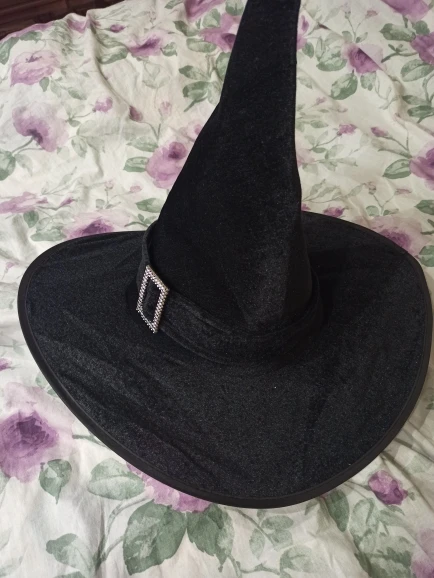 Прикольная шляпа. Материал под бархат, поля жёсткие за счет ободка из проволоки, т.е. согнуть поля и зафиксировать не выйдет, они всегда натянутые. Конус тоже мнется и фиксируется неохотно, можно чуть усилить эффект и просто зафиксировать канцелярским зажимом. За свои деньги отличный реквизит для фото.