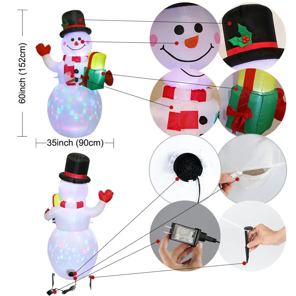❤Смешной рождественские садовые украшения: впечатляюще стоит на высоте 5 футов при надувании. Милый надувной Рождественский Снеговик, подарит Привет, заставит ваших детей и гостей визжать от восторга❤Обновленные вращающиеся светодиодные фонари: 3 супер ярких цветных вращасветодиодный ных фонаря, встроенных в украшение для двора. Обязательно осветит ваш газон или сад и превратит ваш дом в зимнюю страну чудес❤Прочное качество: Изготовлен из высококачественного полиэстера, устойчив к атмосферным воздействиям и выцветанию. Оснащен мощным водонепроницаемым встроенным вентилятором, просто подключите его к розетке и через несколько секунд у вас будет милый светящийся надувной снеговик❤Мешки с песком и крепление веревкой: поставляется с 4 кольями и тросами для быстрой и легкой установки, а также 2 фиксированными мешками с песком, чтобы они стояли без поддержки. Не нужно беспокоиться, что Рождественское украшение со снеговиком улетит от ветра❤Идеальные надувные рождественские уличные садовые украшения (OurWarm профессионально подходит для всех видов праздничных принадлежностей. При возникновении любых проблем просто напишите нам, мы всегда готовы предоставить вам 100% удовлетворенное обслуживание.)