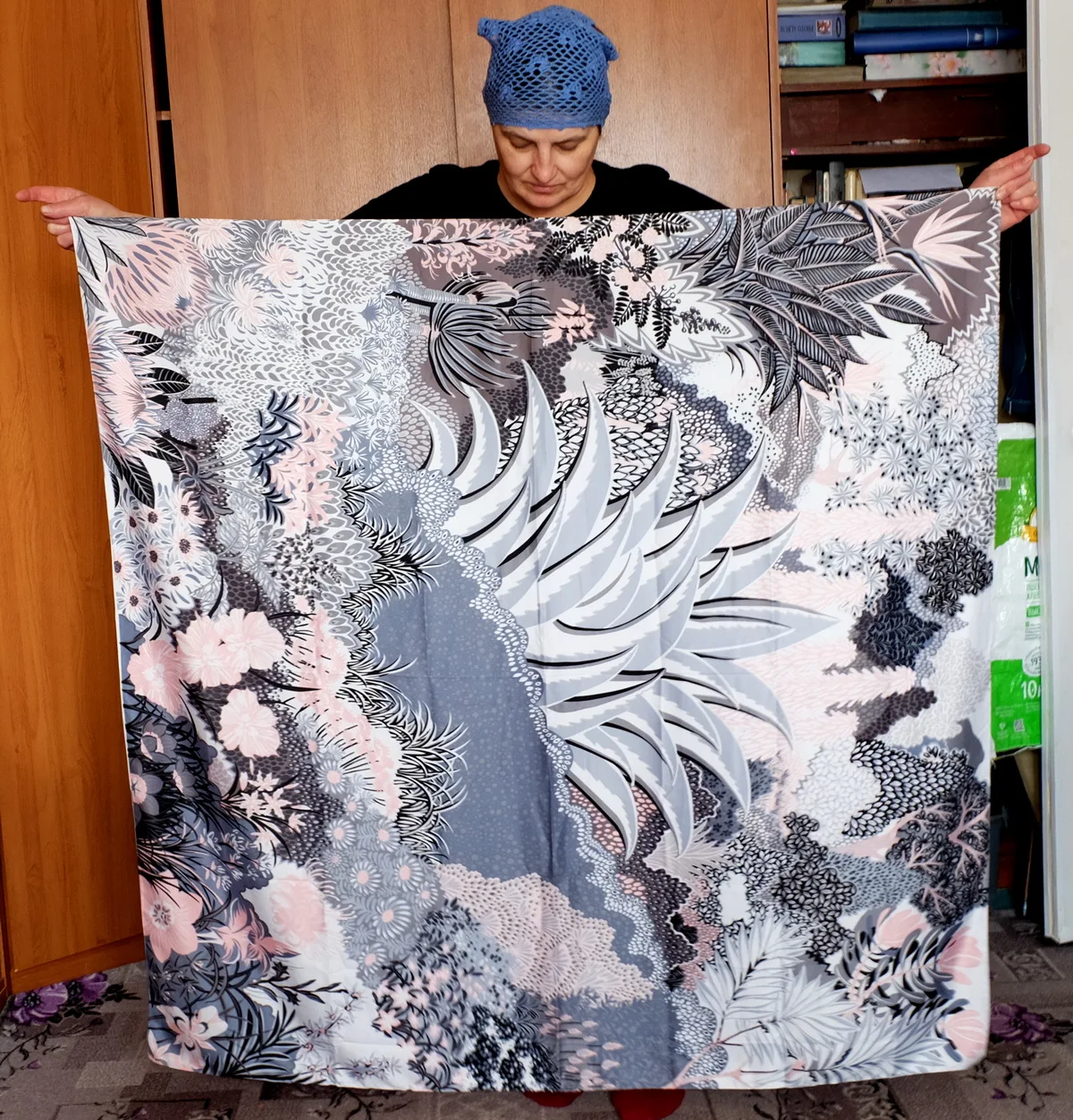 Отличный платок, большой, достаточно тонкий, лёгкий, качество печати великолепное. Но почему то пришёл абсолютно мокрый, аккуратно сложенный. Я ещё удивилась, почему такая бандероль тяжёлая, ведь там всего лишь платок. Можно было выжимать. Это что-то новое, я с таким ещё не сталкивалась. Интересно, присылали ли ещё кому-то вещь в таком состоянии? Зачем?