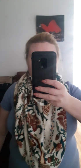 Классный платок, он большой, что мне понравилось, строчка хорошая, ровная, немного электризует что говорит не о точном его составе, но в целом неплохо, весна -осень