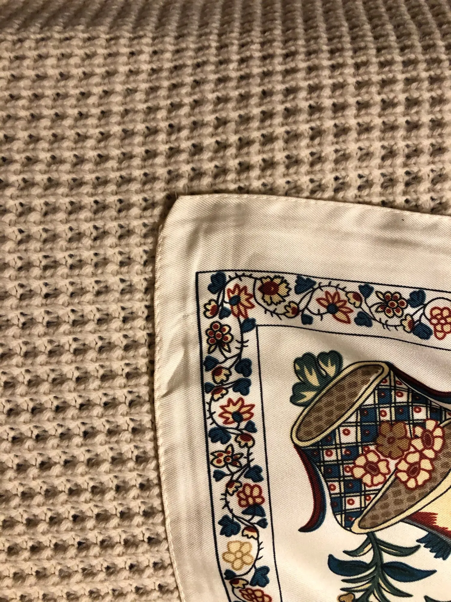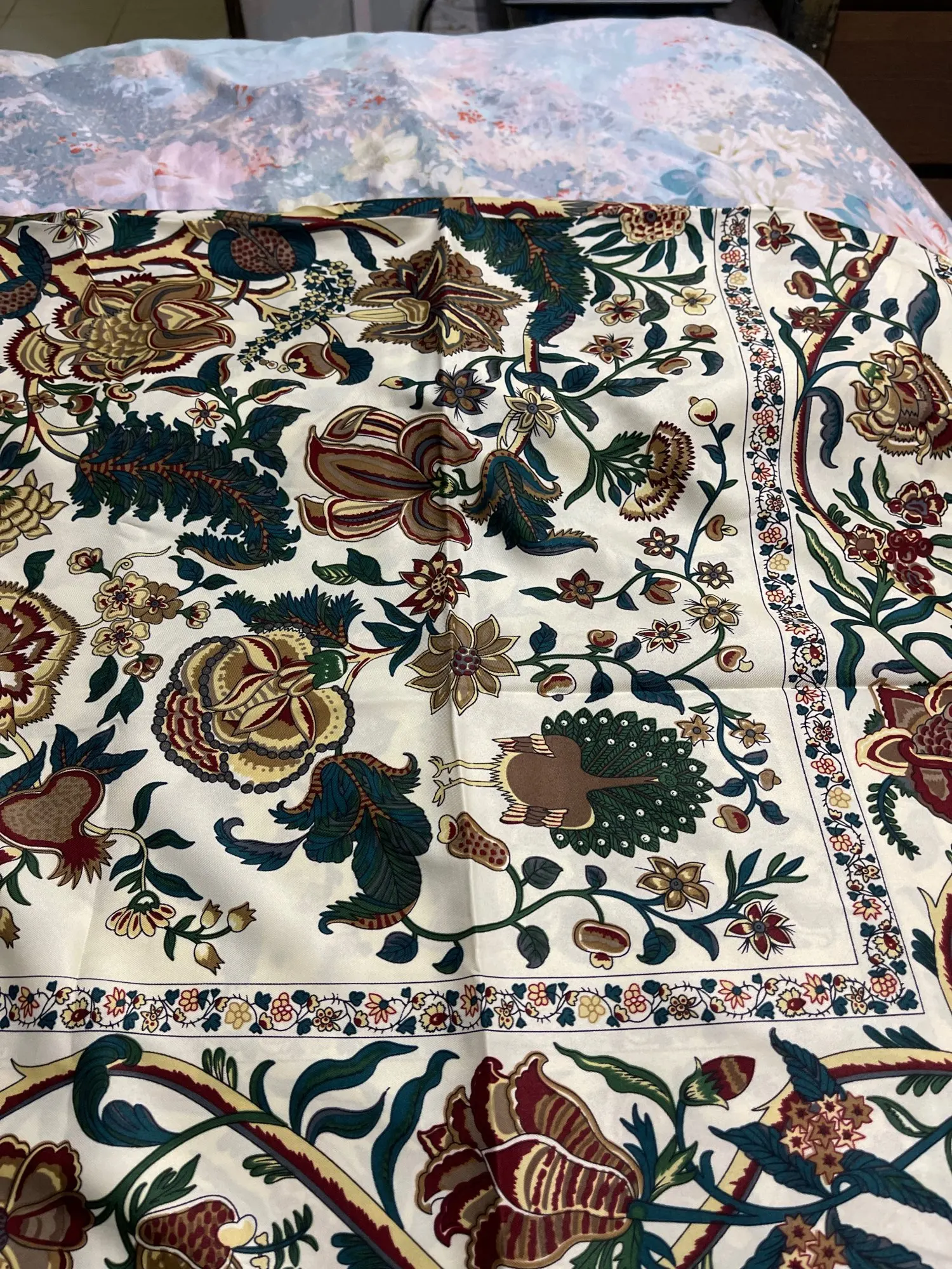 Платок получила на удивление быстро, именно то, что заказывала. На платке бирка 100% silk, ткань плотная и гладкая, в целом приятная, цвет платка темнее чем на фото, более сливочный, чем белый, с размером я несколько просчиталась, платок реально большой. В целом покупкой довольна.