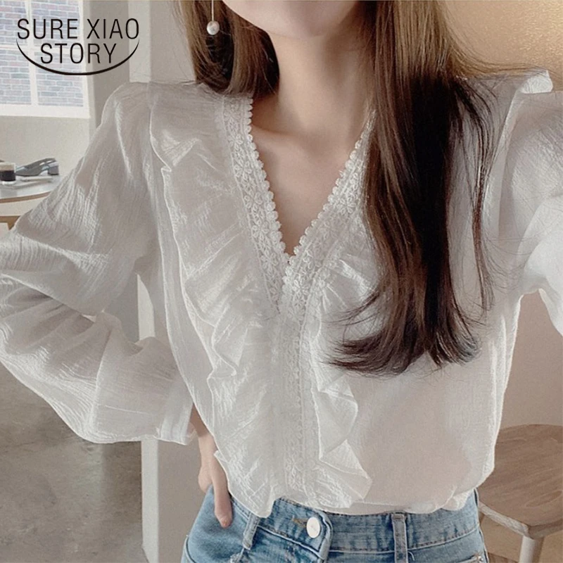 2020 белые женские туфли рубашка милые женские сапоги ", с О-образным вырезом, с оборками, с длинными рукавами, кардиган, женская блуза в Корейском стиле OL Топы 0974 30