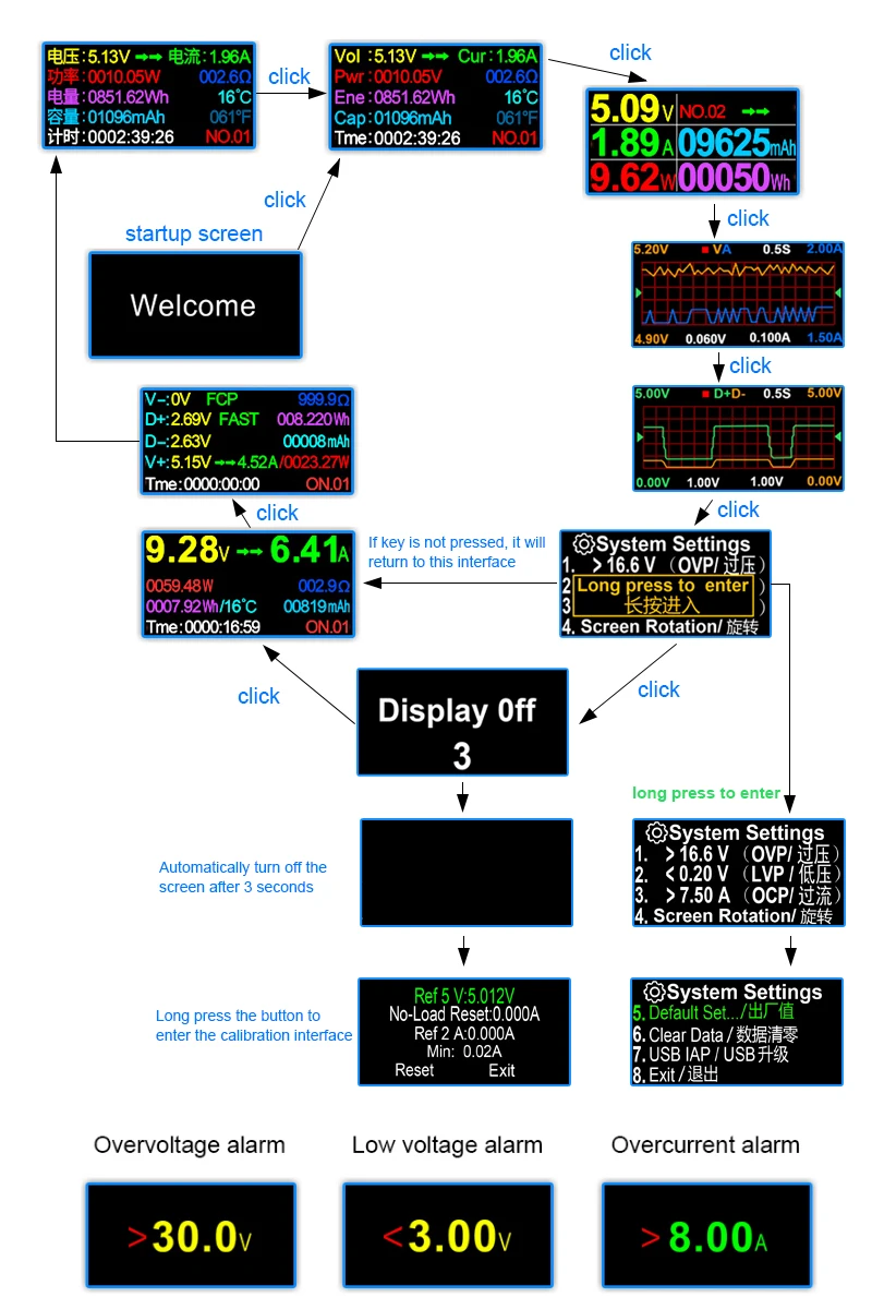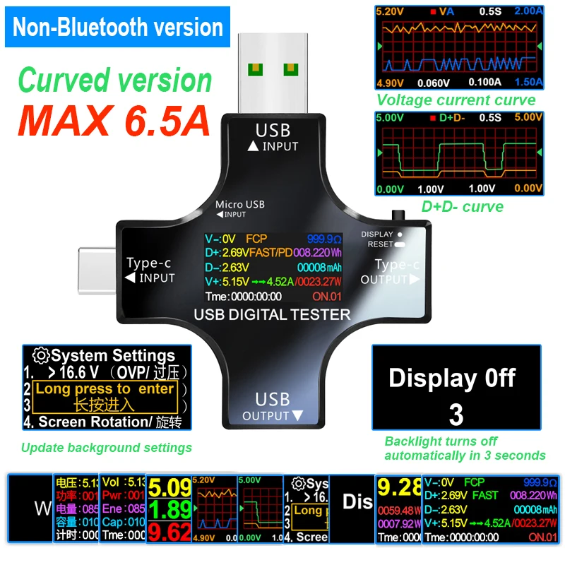 Отличный юсб тестер, есть куча режимов работы. Показывает силу тока, напряжение в вольтах, мощность ватт, прошедшее время работы, температуру. Можно замерить емкость аккумулятора, поставить таймер до выключения и время горения экрана