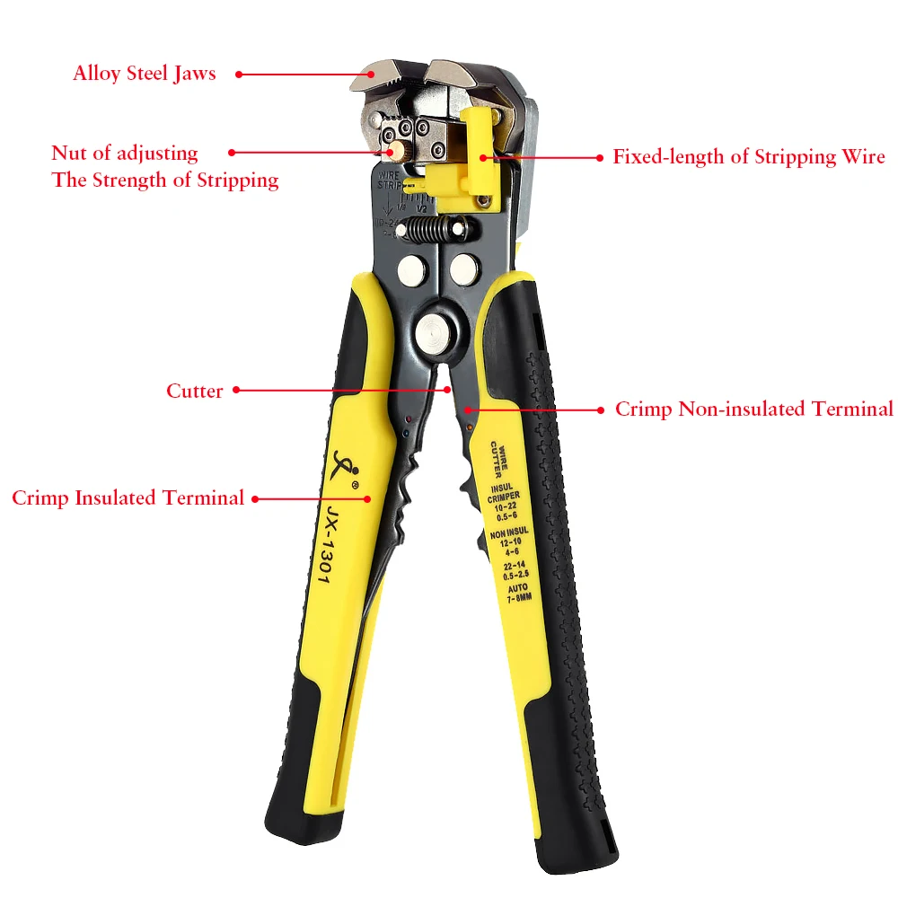 Эти профессиональные обжимные инструменты с саморегулируемыми обжимными плоскогубцами и зачистки проводов отличаются удобством, эффективностью и безвредностью сердечников кабеля. Он прост в использовании, просто удерживайте ручку и управляйте ею один раз, чтобы успешно нажать плотно прилегающие провода и клеммные блоки.Особенности:С 5 взаимозаменяемыми клеммами с различными диапазонами обжима.Профессиональный инструмент для обжима проволоки с саморегулируемым механизмом храповика для удобства эксплуатации.Подходит для большинства неизолированных обжимных терминалов и разъемов.Мульти-функциональный провод для зачистки с модернизированной конструкцией и многое другое одноразовая бритва с удобной ручкой для проводов от 24 до 10AWG (0,2-6.0mm ²).Благодаря большому захвату ручки, легкая и компактная конструкция и конструкция ручки обеспечивают идеальный эффект обжима.Разработан в соответствии с инженерными факторами человека, он может экономить 50% энергии при обжиме.Пластиковый ящик для инструментов имеет гидроизоляцию поверхности и больше подходит для переноски и длительного хранения.Характеристики:Название бренда: PARONМодель: JX-D5301SМатериал: Высокоуглеродистая сталь + сплавЦвет: желтый + черныйПодходящие клеммы и Диапазон обжима проводов:JX 1601-01: цветные гнезда + изолированные клеммы 24-14 AWG (0,25-2.5mm ²)JX 1601-06: конец шнура терминалы 24-10 AWG (0,25-6.0mm ²)JX 1601-08: неизолированный открытый Цилиндрический разъем 26-16 AWG (0,14-1,5 мм ²)JX 1601-10: неизолированный открытый Цилиндрический разъем 28-18 AWG (0,1-1.0мм ²)JX 1601-2546: MC4 солнечной разъем клеммы 14-10 AWG (2,5-6.0mm ²)Зачистки диапазон автоматический инструмент для зачистки проводов: 24-10 AWG (0,2-6.0mm ²)Размер проволоки: прибл. 190*80*20 мм/7,48*3,15 * 0.79inВес щипцы для проволоки: прибл. 348,5 г/12,29 унцийАвтоматический Размер зачистки проводов: прибл. 210*108*28 мм/8,27*4,25*1,10 дюймовВес автозачистки проводов: прибл. 316 г/11,15 унцийРазмер посылка: прибл. 23,5*18,5*4,5 см/9,25*7,28 * 1.77inВес посылка: прибл. 1010 г/35,63 унцийПримечание: Пожалуйста, обратите внимание на направление анастомоза штампов и терминалов при работе, в противном случае штампы будут вспыхивать.Посылка:1 * JX-1601 щипцы для проволоки1 * JX-1301S автозачистки проводов1 * S2 отвертка4 * Запасные штампы4 * винты1 * ящик для инструментов