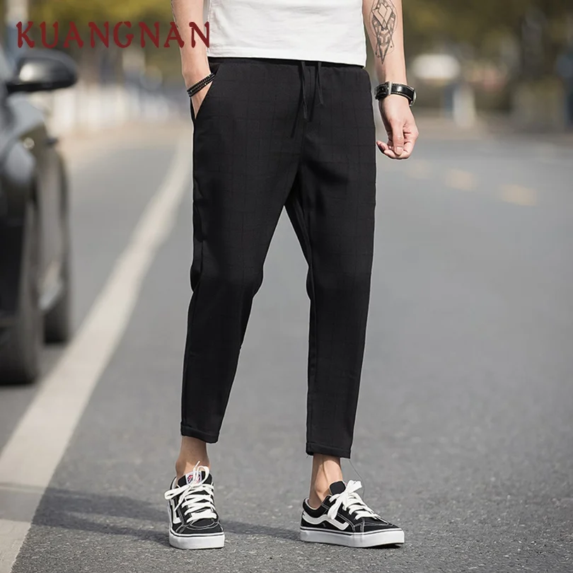 KUANGNAN, льняные клетчатые брюки длиной до щиколотки, мужские брюки в стиле хип-хоп, штаны для бега, мужские спортивные штаны, уличная одежда, мужские штаны, 2019 весна, Новинка