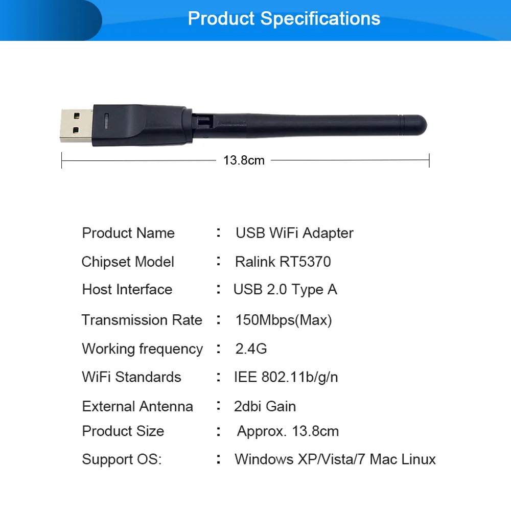 Беспроводная сетевая карта CHIPAL Ralink RT5370, мини USB 150, Wi-Fi адаптер 2 дБи, 2,0 Мбитс, Антенна ПК LAN, Wi-Fi-приемник, ключ 802.11n