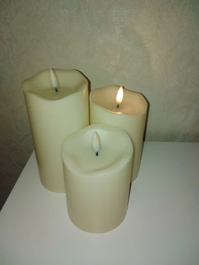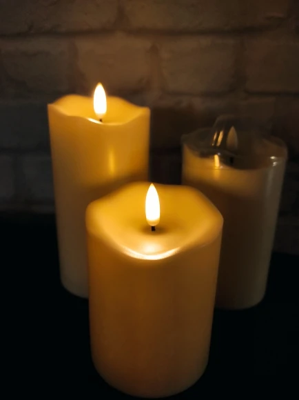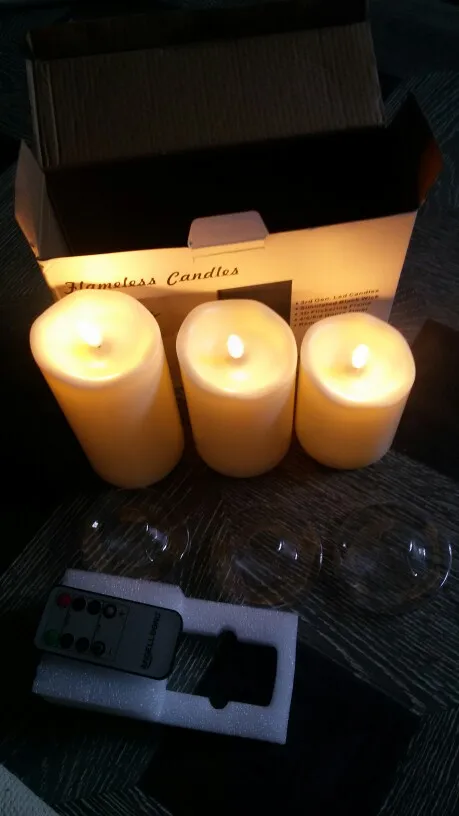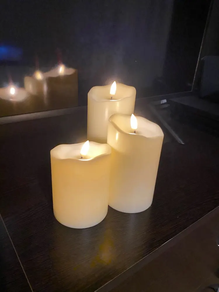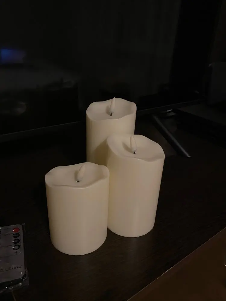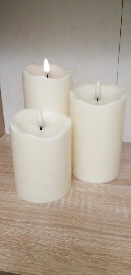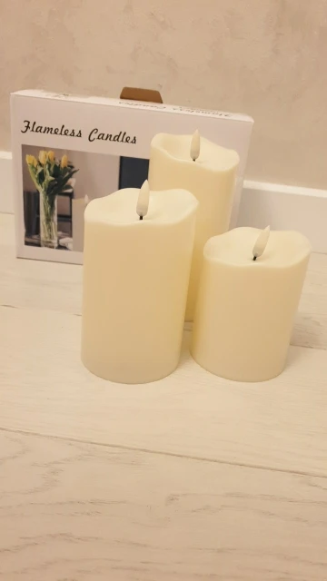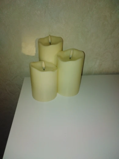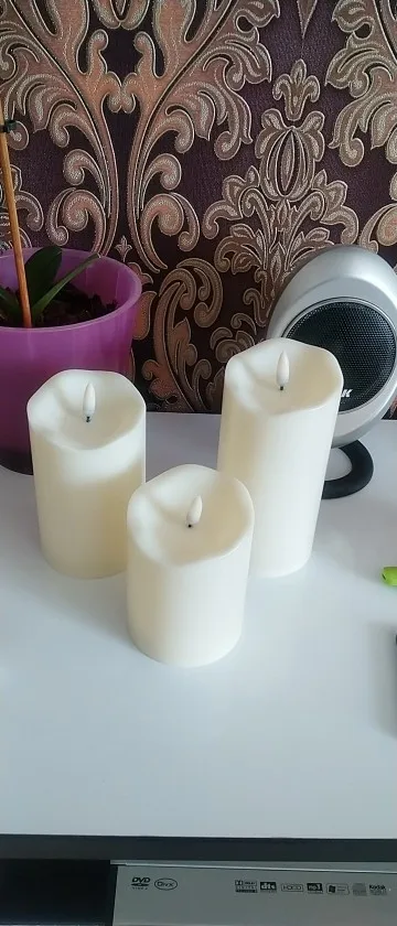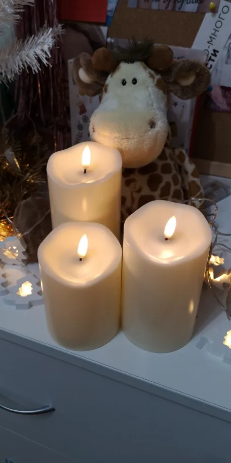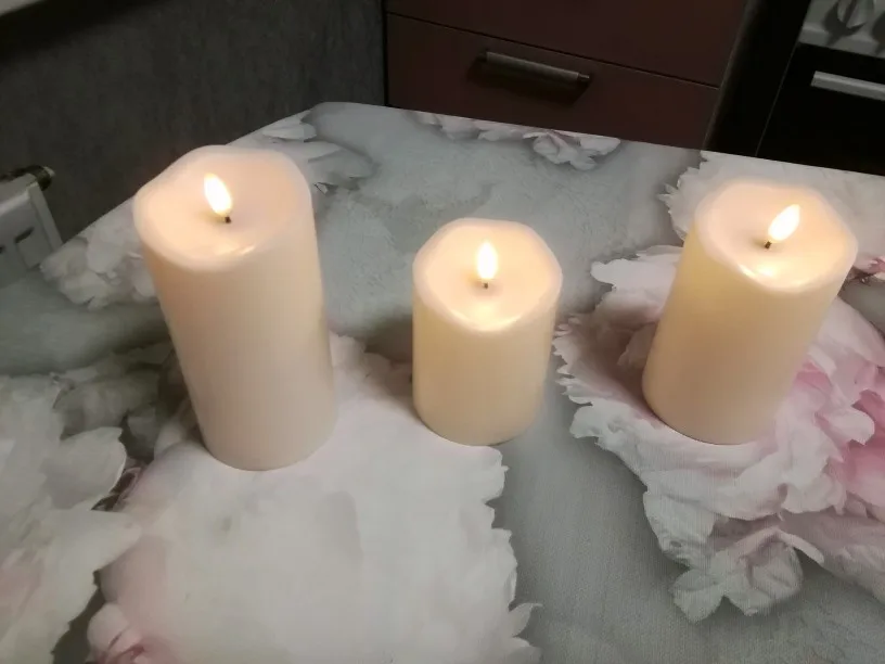 В кратце: свечи просто супер! Теперь немного подробнее. Свечи не парафиновые, как написано в описании, а пластиковые, но не смотря на это в дневном освещении выглядят нормально. Жаль только что форма верха у всех одинаковая. Толстенькие, но очень легкие. Работают от 2х пальчиковых батареек каждая (нет в комплекте). Есть пульт (батарейка в комплекте). Пультом можно включить/выключить, регулировать яркость, поставить таймер выключения на 4, 5, 6 или 8 часов. Фитиль не колышется, он статичный. И, наконец, самое главное: в горящем состоянии выглядят очень круто и реалистично! Такое спокойное пламя горящей свечи, мерцающее. Правда, если свечи стоят вместе, то когда их включаешь, они мерцают все одинаково, лучше поочередно включать для лучшего эффекта. Однозначно рекомендую. Есть доставка из России, она просто моментальная, 3 дня, до двери.