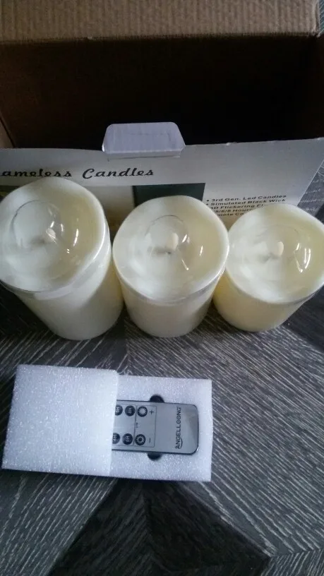 Заказала 13 октября, получила 19-го!!! 6 дней, Карл!!!!! это очень круто. Сами свечи очень аккуратные, внутренности не просвечивают. Правда я думала, что штырек с пламенем будет шевелиться и "танцевать" и немного расстроилась, когда этого не произошло. Но свет пламени очень мягко и естественно мерцает, поэтому свечи все равно выглядят очень натурально. Пульт пробовала на каждой свечке отдельно - он не сработал. Возможно нужно включить все три свечки. Завтра проверю. Но даже без пульта я очень довольна, уверена, что это лучший вариант свечей на Али!