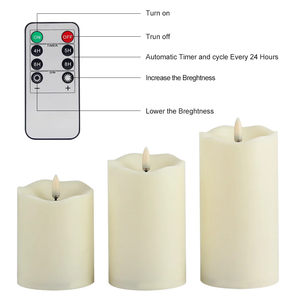 Свечи просто восторг! Есть с чем сравнить, у нас уже имеется набор подобных свечей, но у них фитилек, имитирующий пламя, как бы утоплен в свечу. Вид совсем другой, а эти очень реалистичные. Довольна покупкой на все 100. В комплекте пульт, укомплектованный батарейками, а вот для свечей нужны 3 пары батареек АА. Продавец очень вежливый, быстро отвечает, доставка молниеносная из России. Очень довольна заказом!