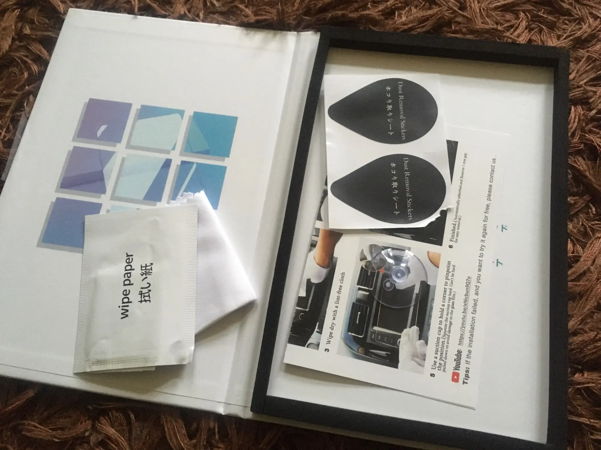 Установка вспомогательных инструментов х 1 (пластиковая присоска, наклейка для удаления пыли, спиртовая салфетка, тряпка из микрофибры для очистки).