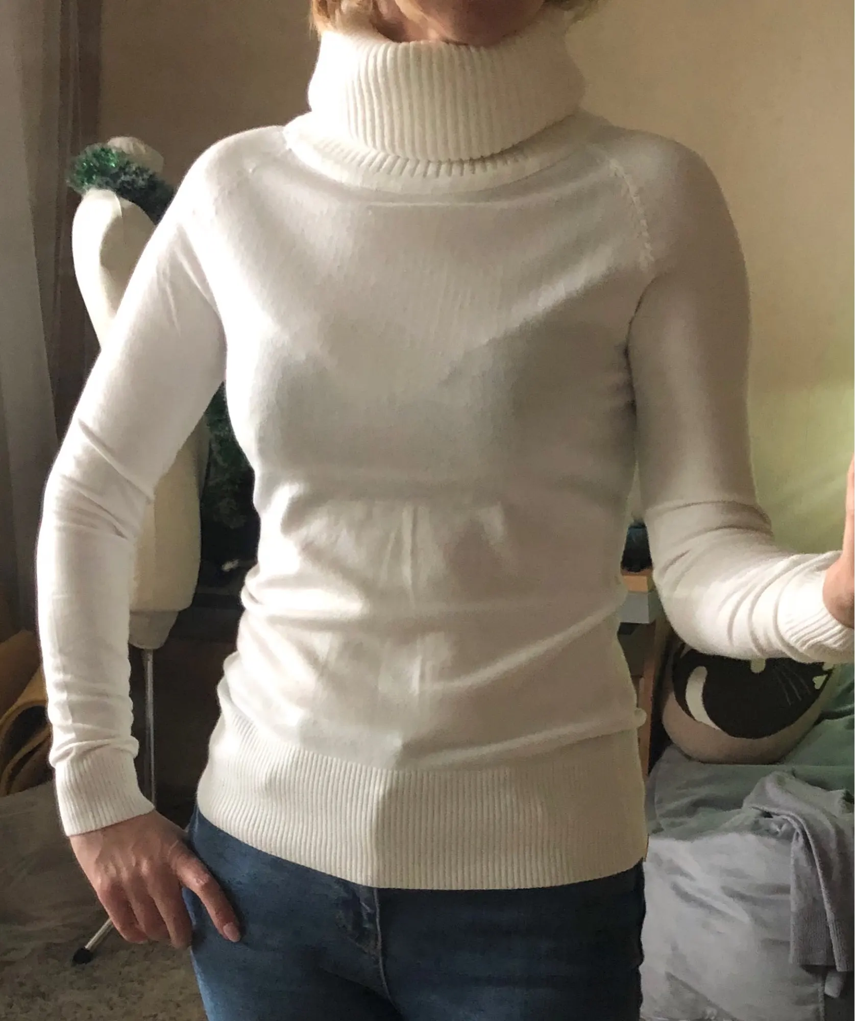 мне пришла водолазка не с большим горлом, а обычным тонким и она в обтяжку фасон. на фото немного иначе.