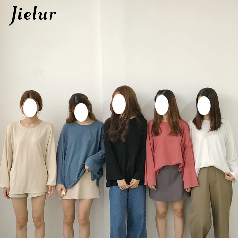 Jielur футболка 7 однотонных цветов Harajuku футболка женская с расклешенными рукавами базовый корейский топ Femme с длинным рукавом белая футболка ropa mujer футболки женские