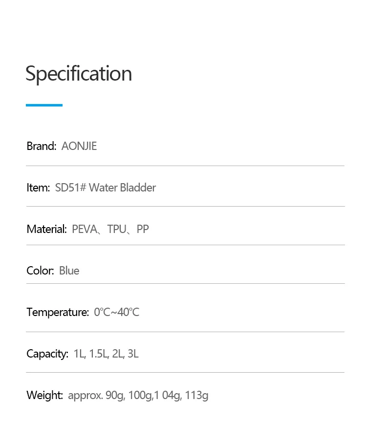 Характеристики: -1 л/1,5 л/2л/3Л водный Пузырь, конечное средство против обезвоживания-легкое и быстрое увлажнение благодаря системе plug-n-play, открытый с ртом, специально разработанная система вкл/выкл для надежного закрытия клапана, а на гибкой трубке длиной 105 см, совместима со всеми рюкзаками Aonijie, розеткой сбоку, Защитный элемент для сопла-ПВС и бисфенол-а бесплатно, ТПУ (термопластичный полиуретан) материал характеристики: ремешок: AONIJIE пункт: SD51 материал водяного пузыря: ТПУ, ПП, PEVA Цвет: синий Емкость: 1Л; 1.5л; 2л; 3л Вес: 90 г; 110 г; 104 г; 113 г Длина соломы: 105 см Применение: бег/Туризм/Велоспорт/альпинизм/Кемпинг Рекомендуемая температура воды:-20 ℃ до 50 ℃/-4 °F до 122 °F посылка Содержание: 1xSD51 водный Пузырь