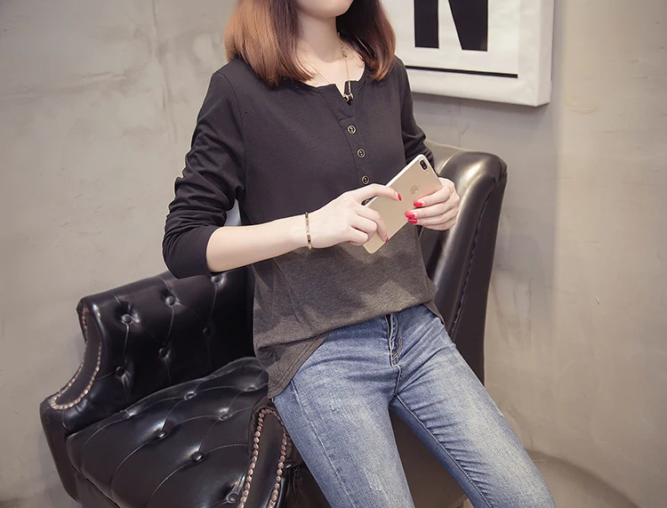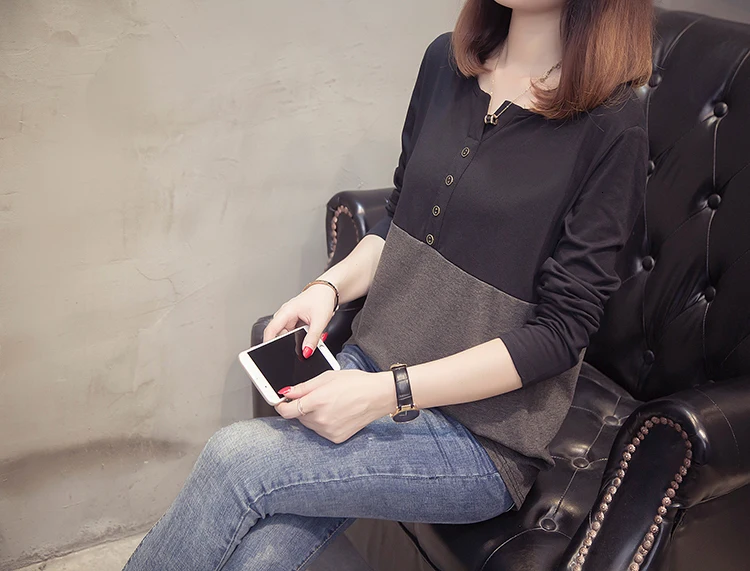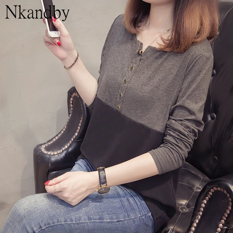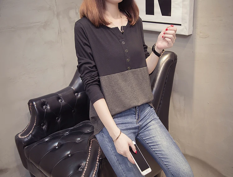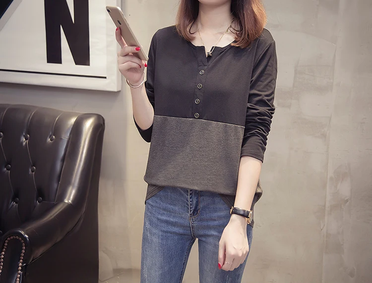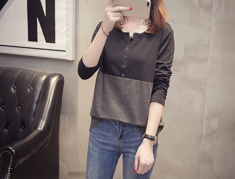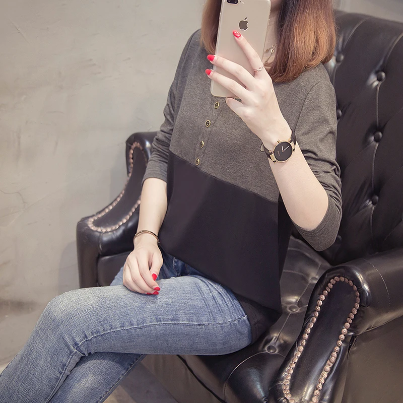 Плюс размер с длинным рукавом Женская футболка 2019 Осень Одежда модная О-образным вырезом Лоскутная женская футболка Крупногабаритная хлопковая футболка Топы