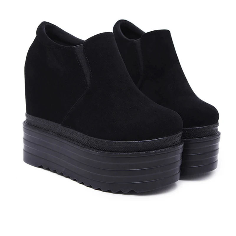 Ботинки на высоком каблуке 13 см осенние черные замшевые ботинки на танкетке Модные женские ботильоны обувь на танкетке, увеличивающая рост
