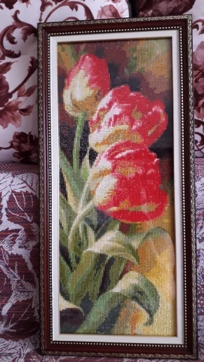 картина не яркая .красные камушки коричневые .Некрасиво.Разочаровалась в заказе.Одного цвета нет.