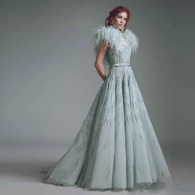 Роскошное вечернее платье без рукавов с мятными перьями, бальное платье с бисером, трапециевидные вечерние платья в арабском стиле, индивидуальный пошив