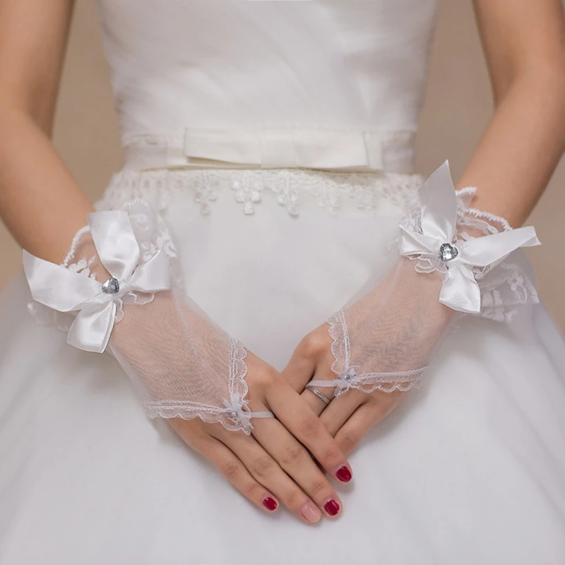 Свадебные короткие перчатки без пальцев, кружевные цветочные Стразы с сердечками и бантом, мягкие свадебные аксессуары